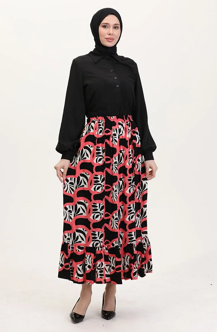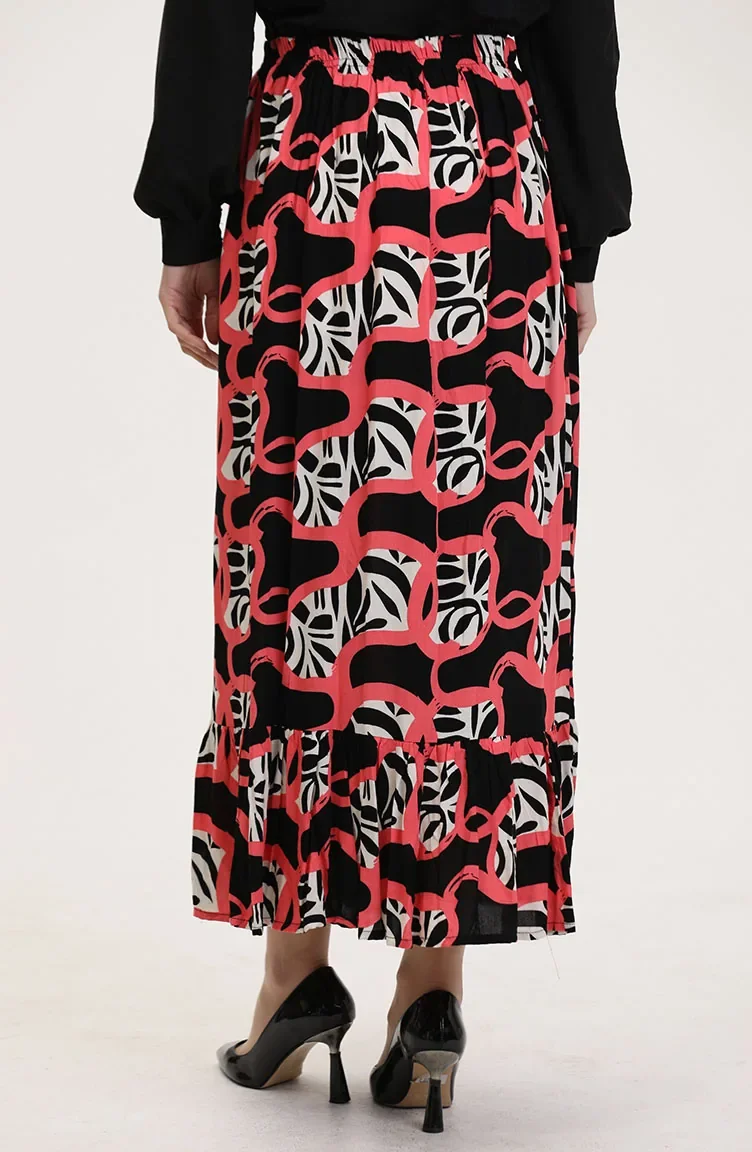 Viskon Kumaş Beli Lastikli Fırfırlı Etek 2012P-03 Siyah Fuşya