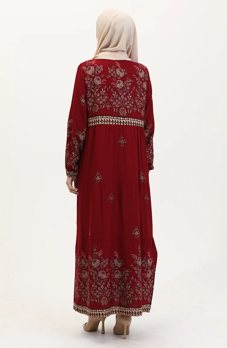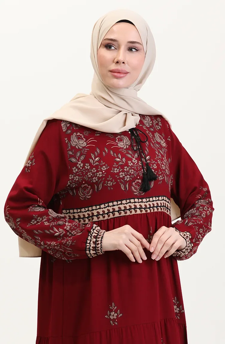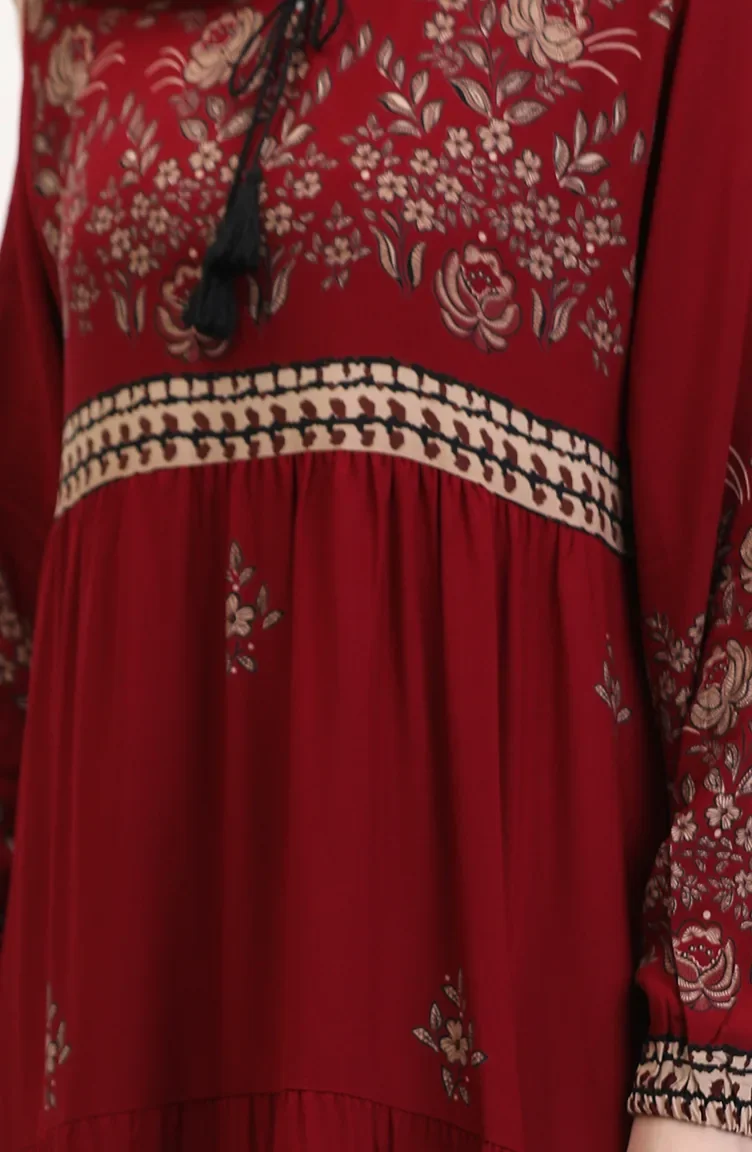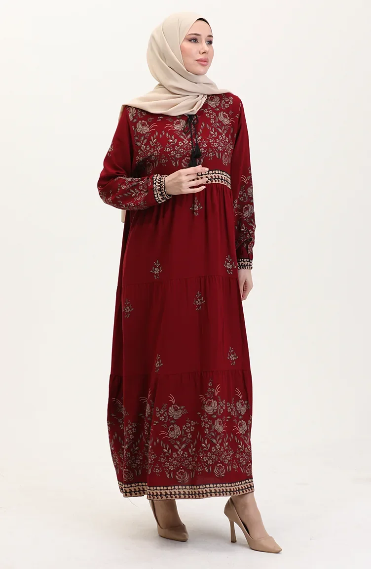Büyük Beden Çiçek Desenli Viskon Elbise 4084-09 Bordo