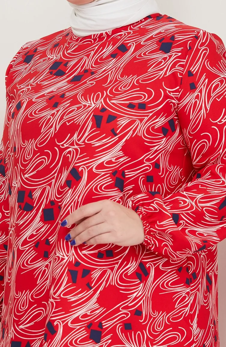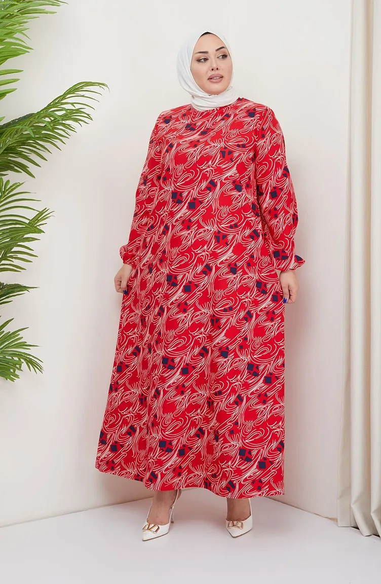 Büyük Beden Desenli Elbise 0710-03 Kırmızı