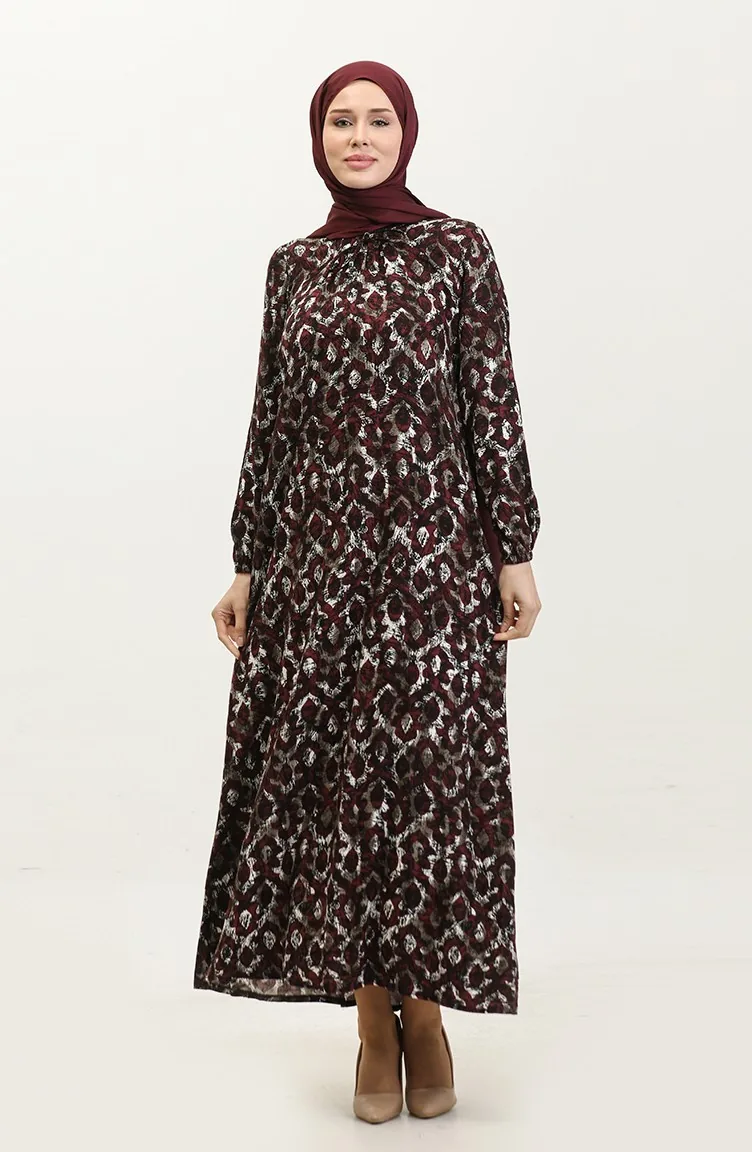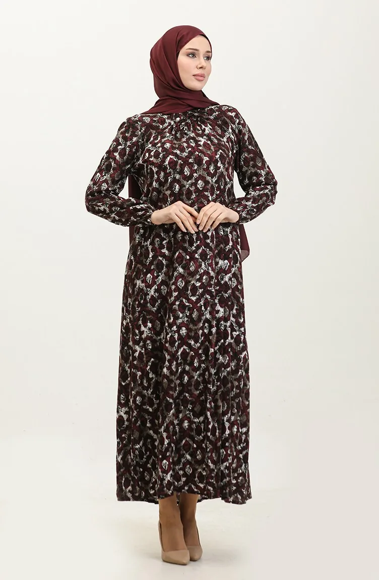 Büyük Beden Desenli Viskon Elbise 44851-01 Mürdüm