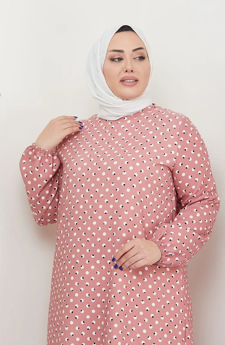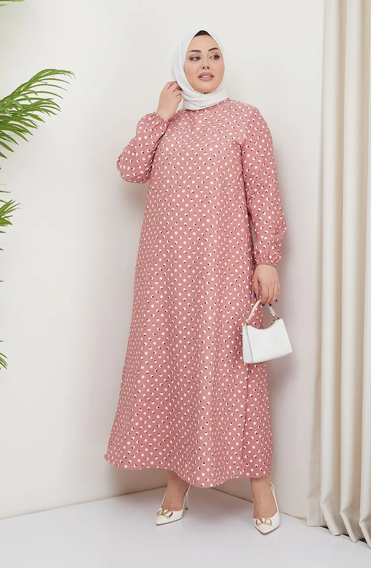 Büyük Beden Puantiye Desenli Elbise 0707-02 Pudra