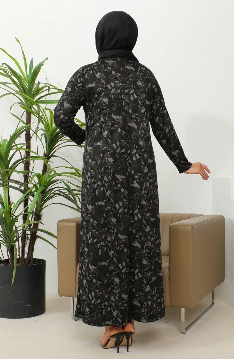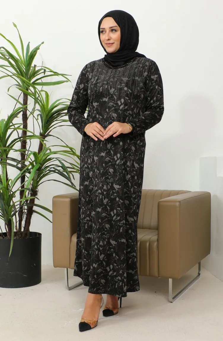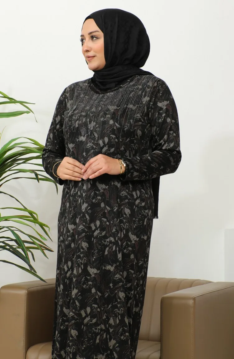 Büyük Beden Taş Baskılı Desenli Elbise 4425B-05 Kahverengi