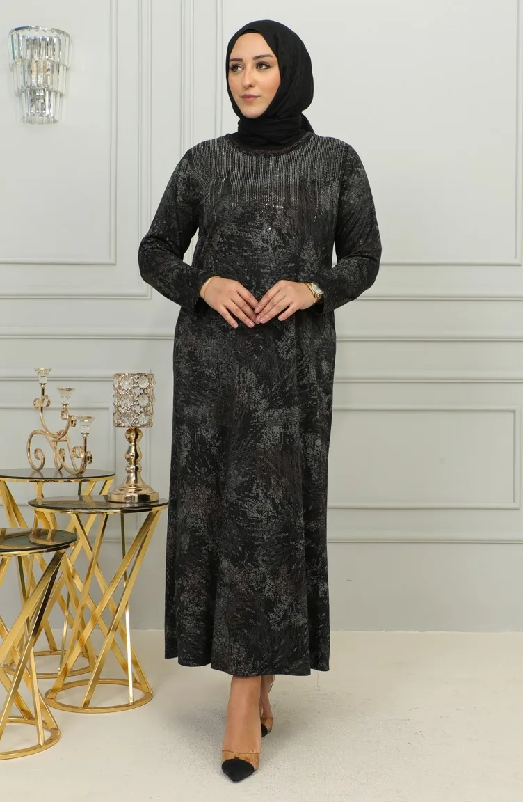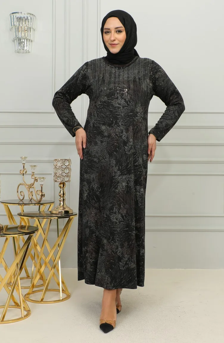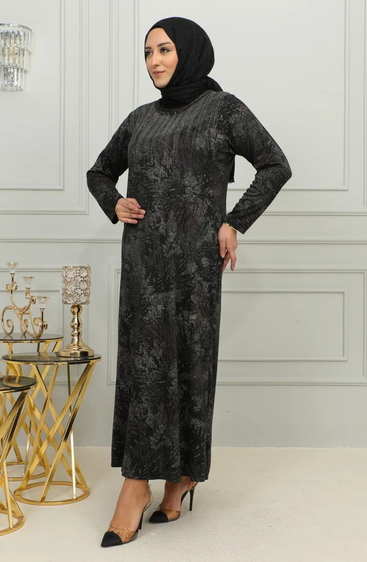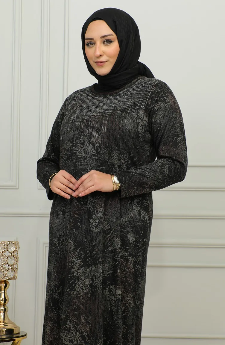 Büyük Beden Taş Baskılı Desenli Elbise 4425D-01 Kahverengi