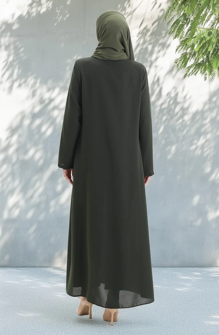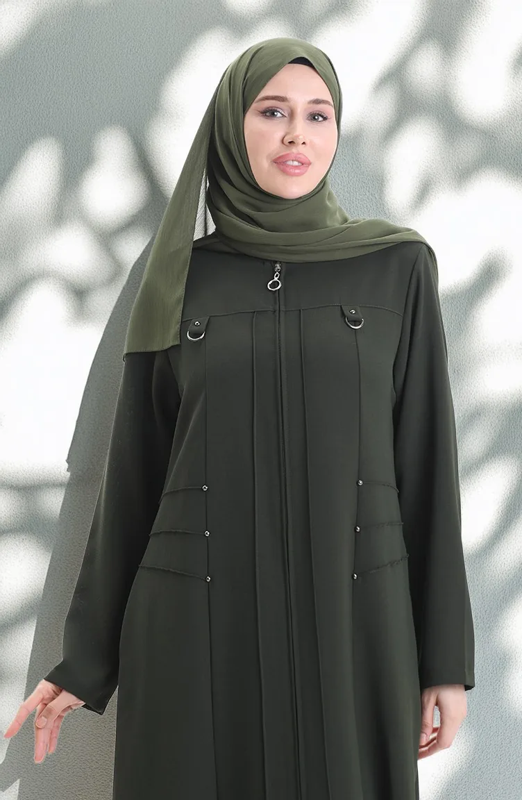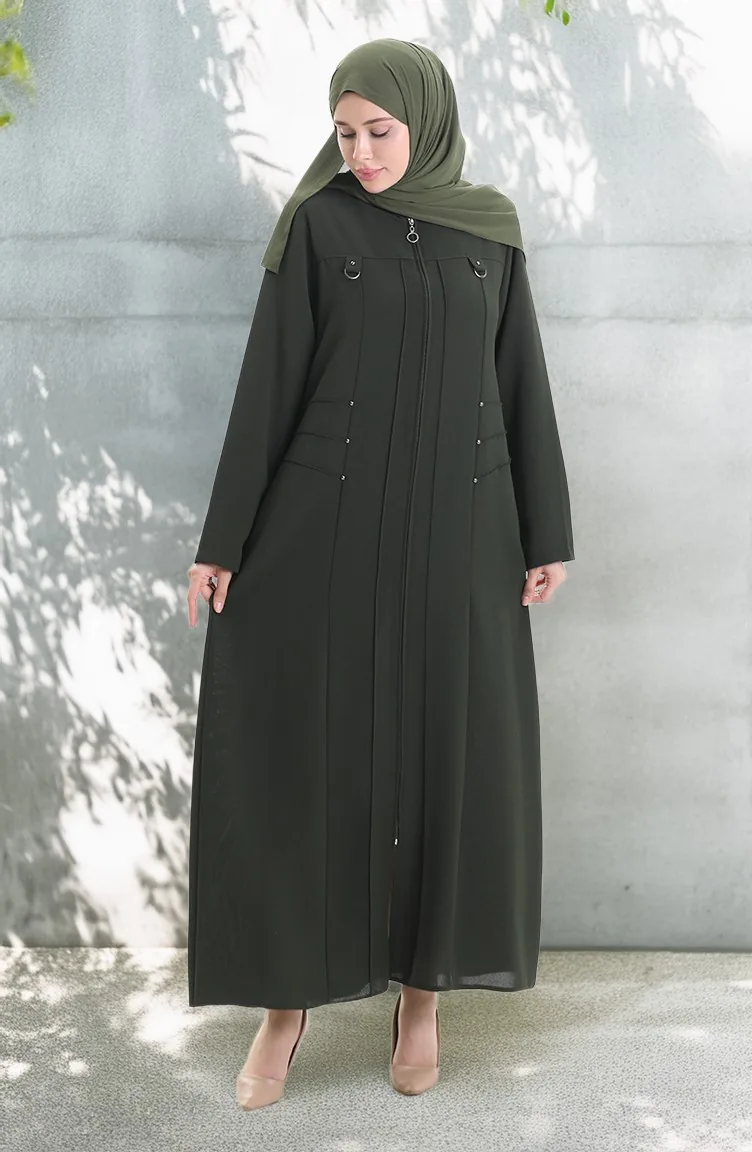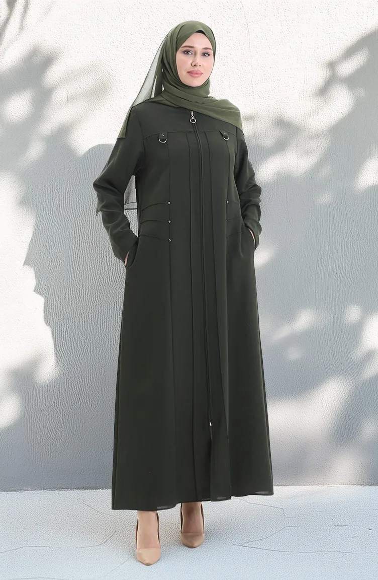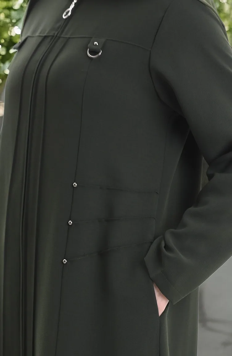 Büyük Beden Metal Boncuk Fermuarlı Ferace 6148-05 Haki