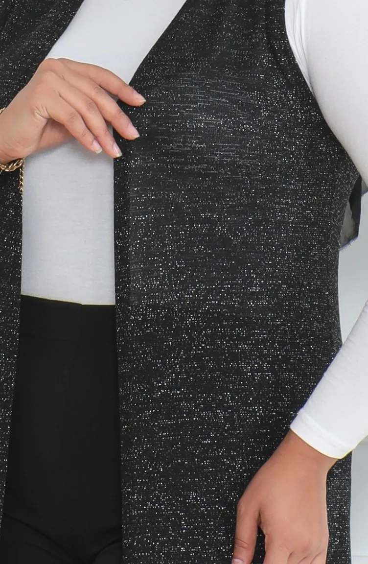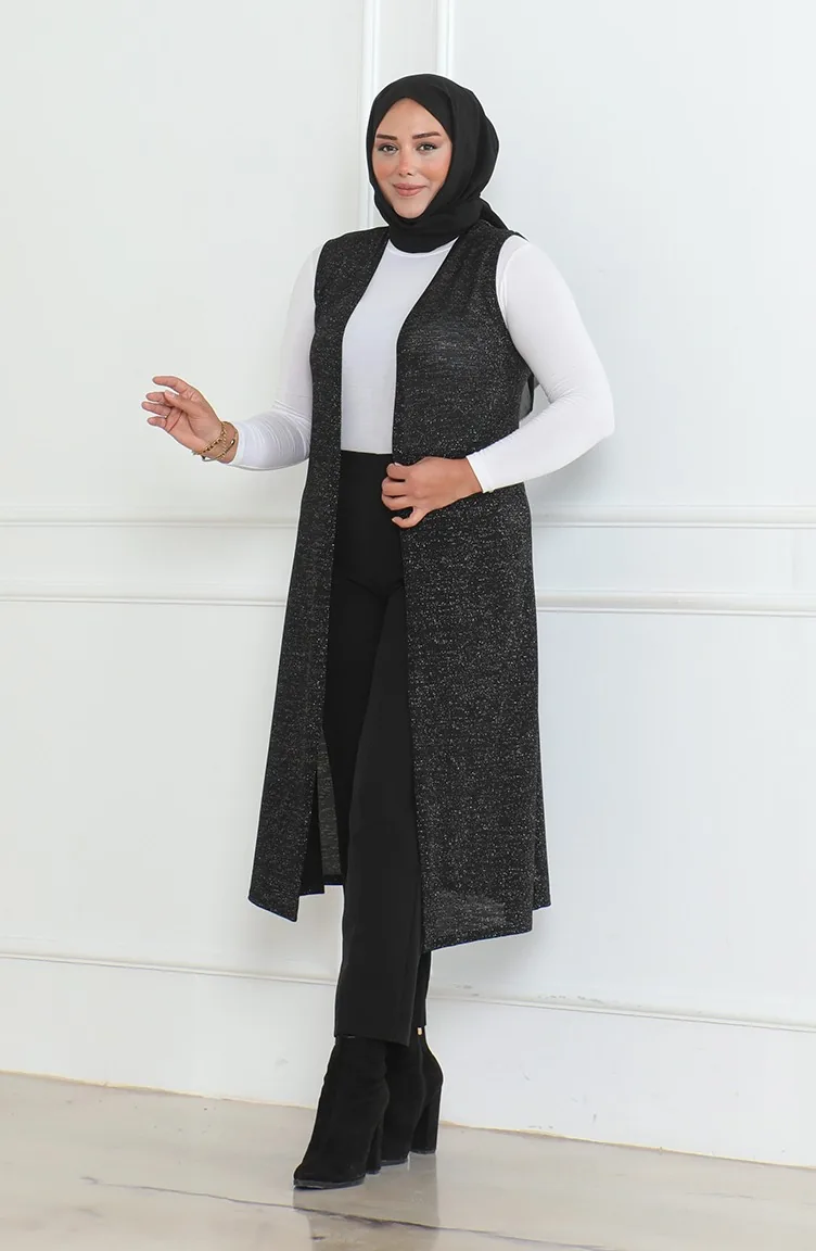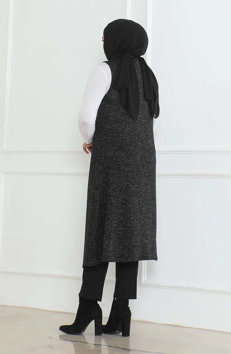 Simli Dökümlü Mevsimlik Uzun Siyah Yelek 8737-01 Siyah