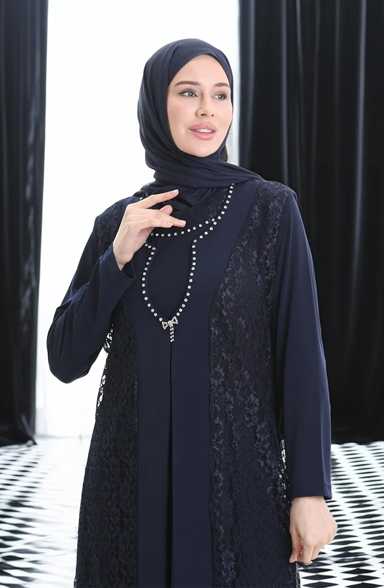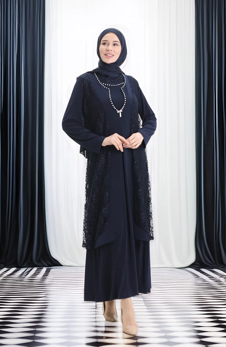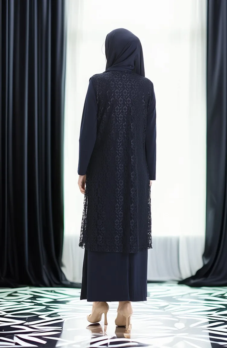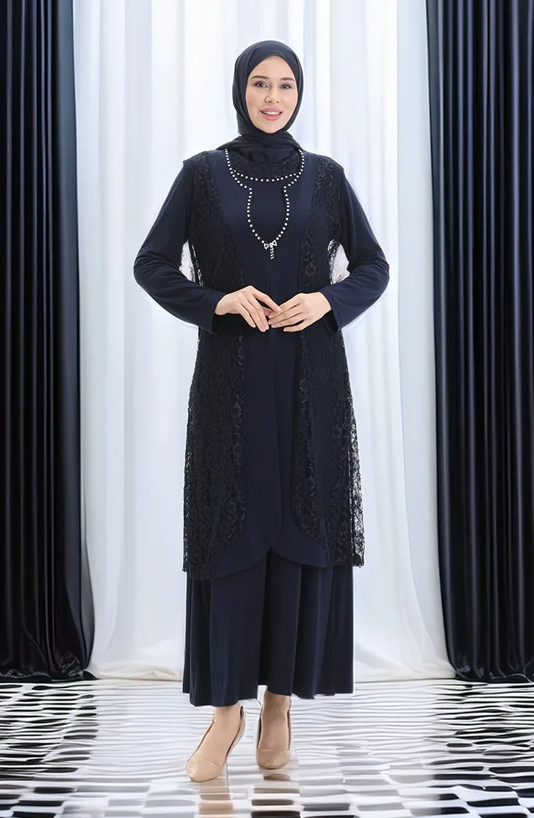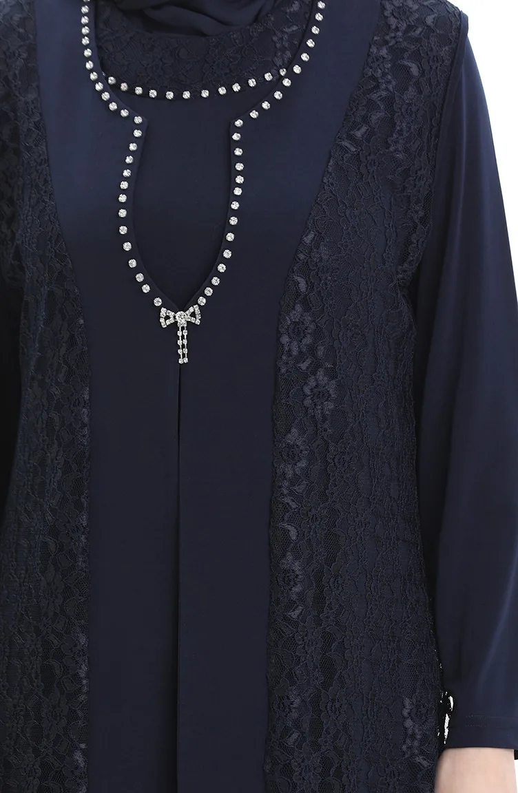 Büyük Beden Dantel Yelek Elbise İkili Takım 4123-02 Lacivert