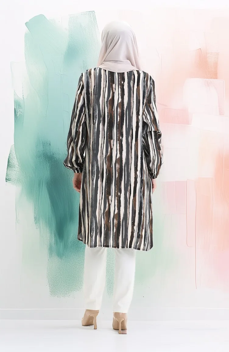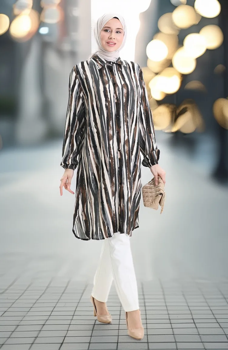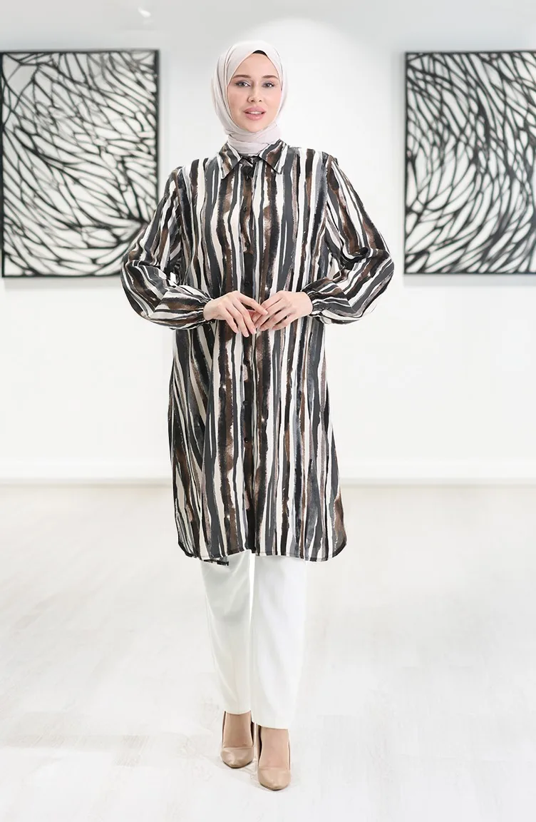 Viskon Düğmeli Tunik 992032E-03 Kahverengi Gri