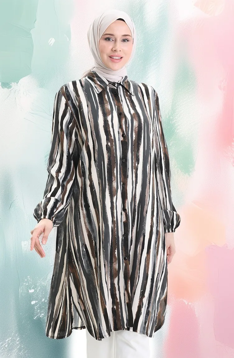 Kahverengi renktedir. Viskon kumaş. Desenli kumaş. Uzun kolludur. Gömlek yaka detayı ile kullanışlı modeldir. Yazlık. Kadın. Büyük beden seçeneği mevcuttur.
