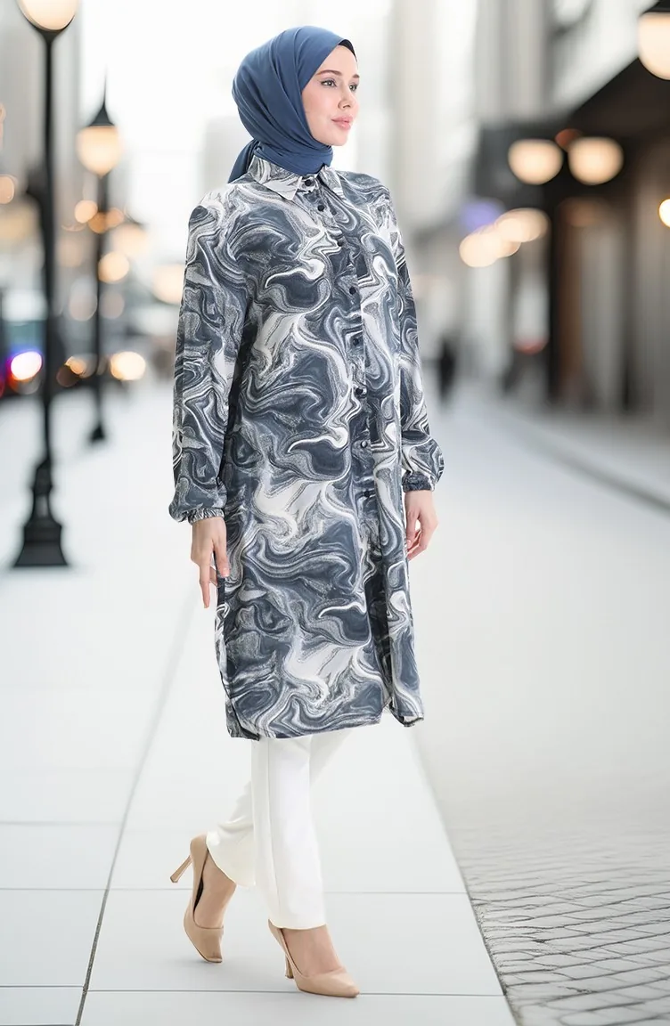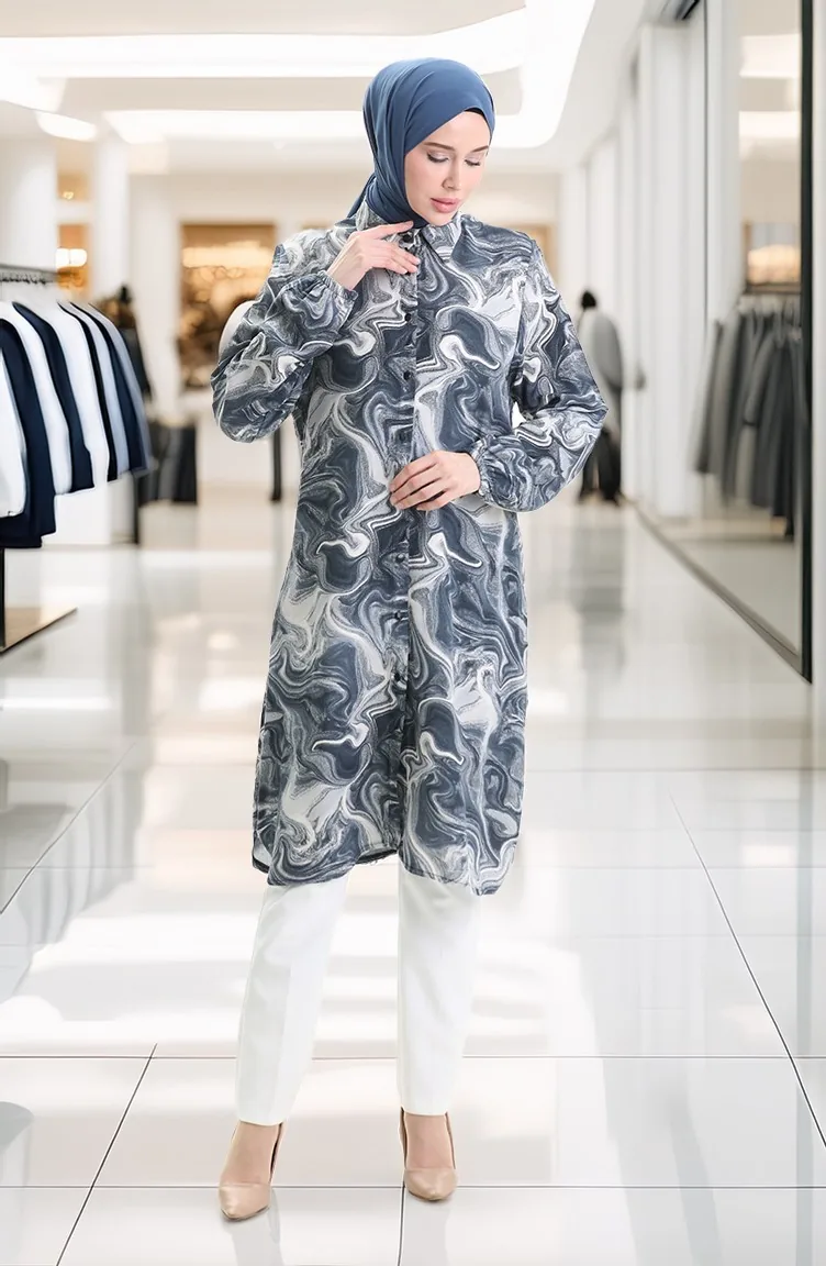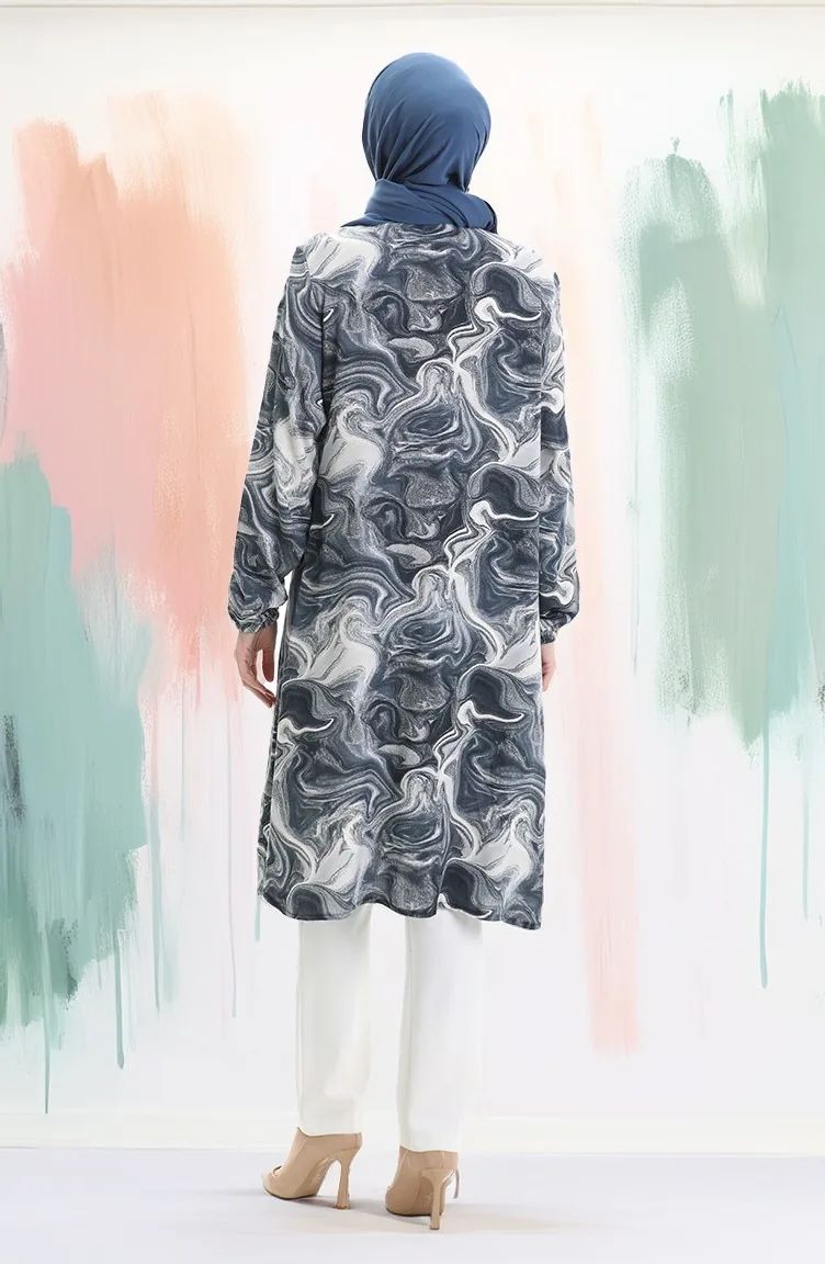 Viskon Düğmeli Tunik 992032F-03 Gri Beyaz
