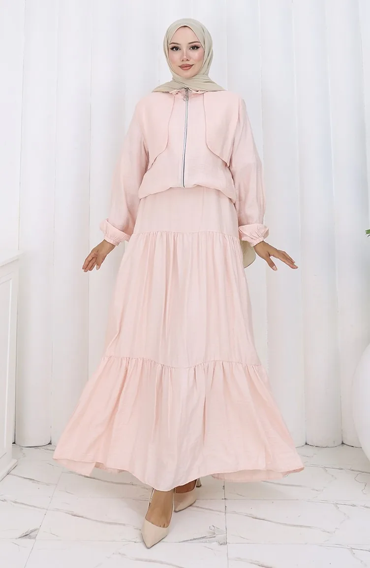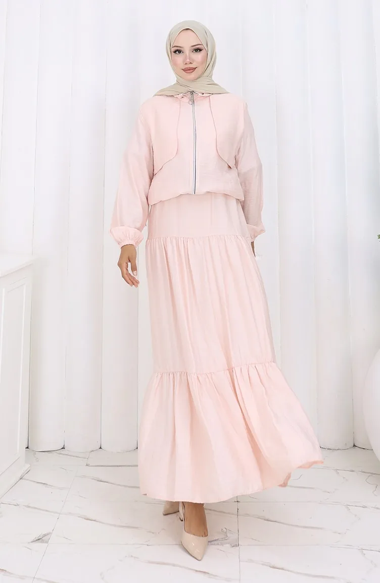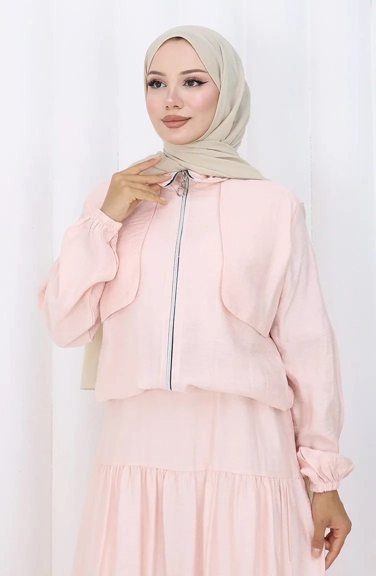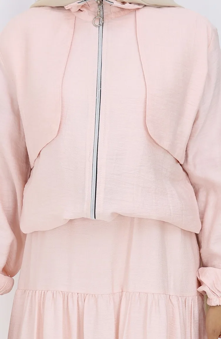Es wird Pulverpinkfarbe verwendet. Baumwollgewebe hat eine saugfähige Textur. Es ist eine klare Sicht. Reißverschluss ist für die einfache Handhabung verwendet. Es besteht aus Gummi Ärmeln. Es ist für vier Jahreszeiten geeignet. Große Größen Option ist verfügbar.