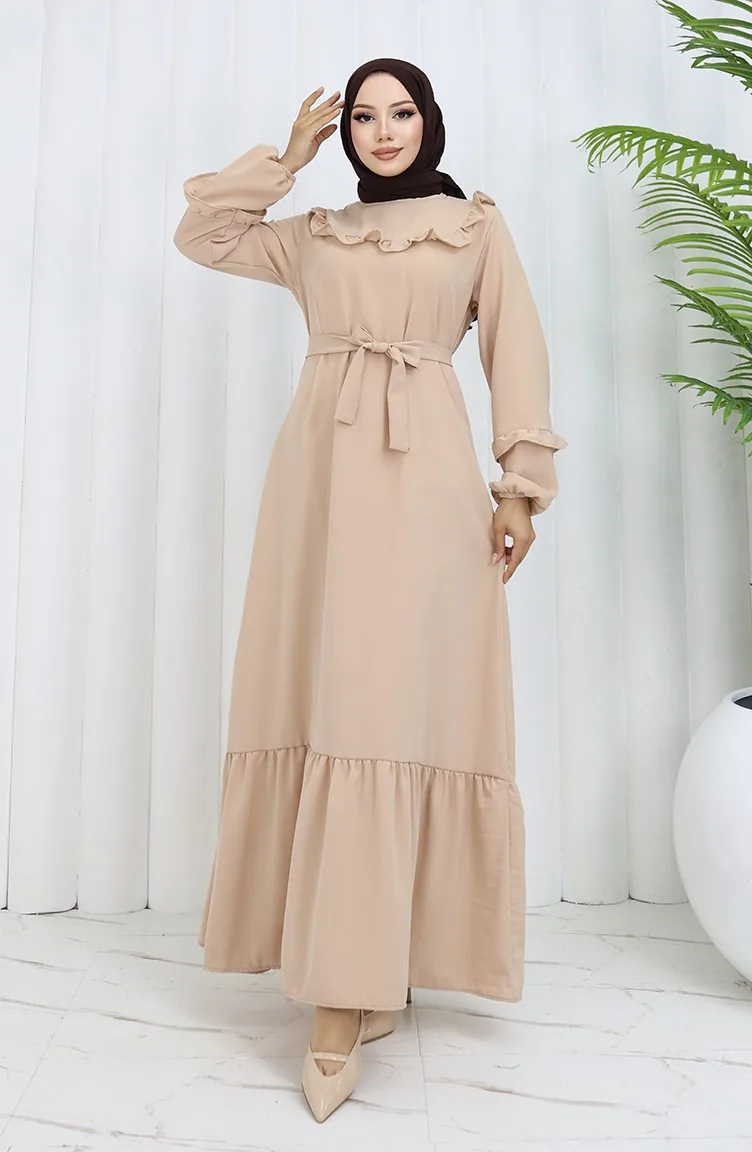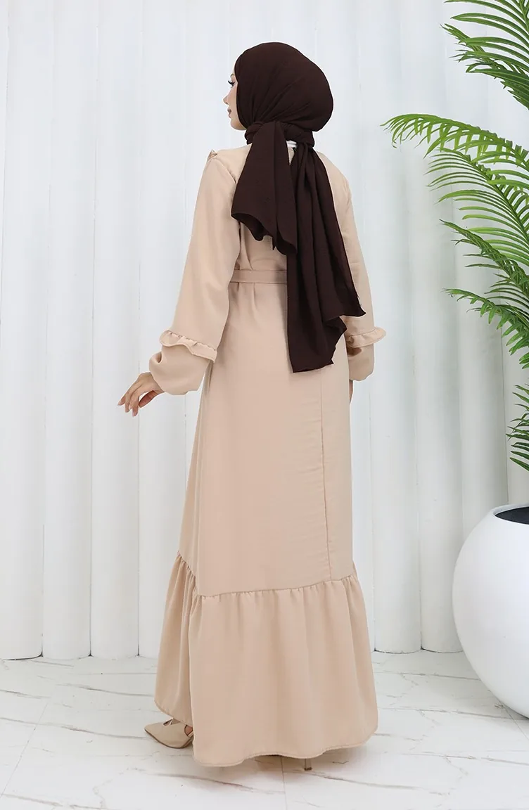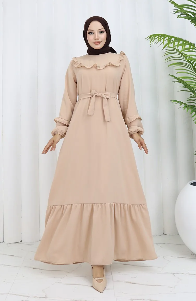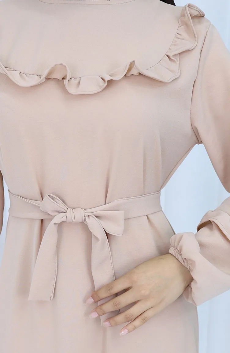 Aerobin Stoff Rüschendetail Kleid 0023-09 Beige 0023-09