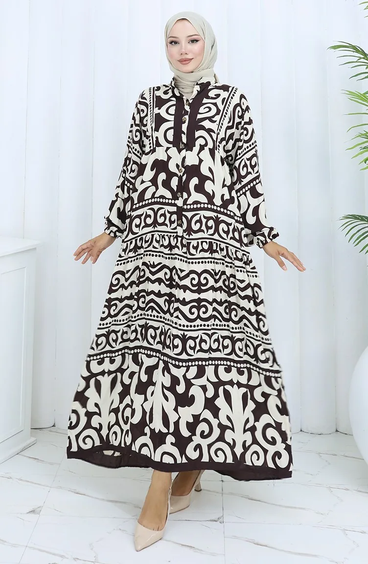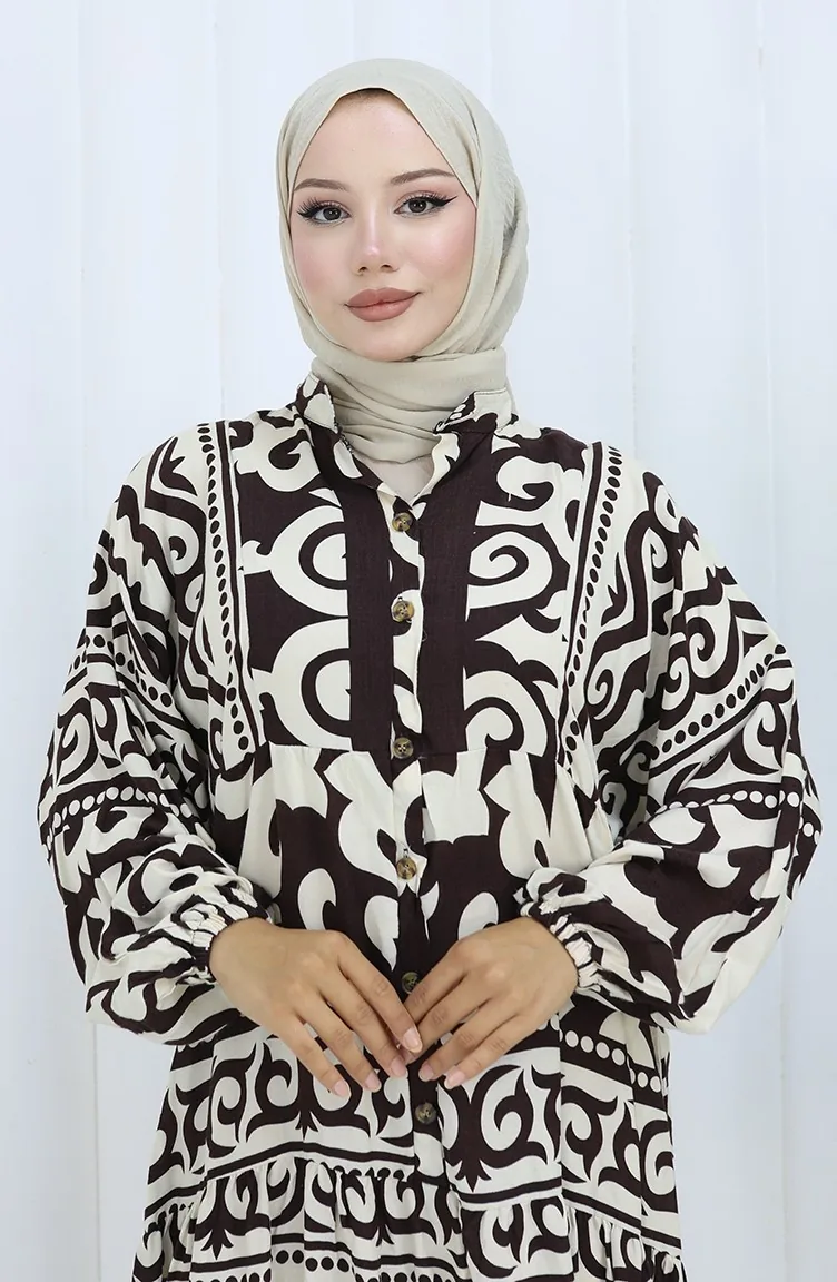 Alaçatı Halbgeknöpftes Kleid Mit Muster 2137-01 Braun Creme 2137-01
