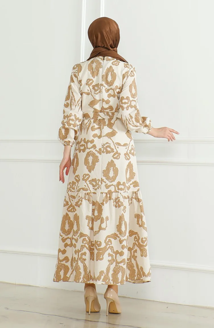 Gemustertes Leinenkleid Mit Gürtel 0471D-04 Beige Milchkaffee 0471D-04