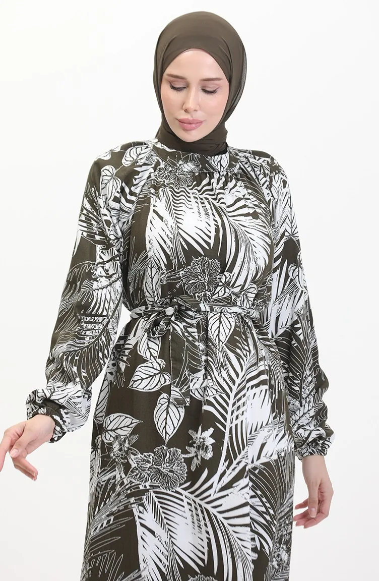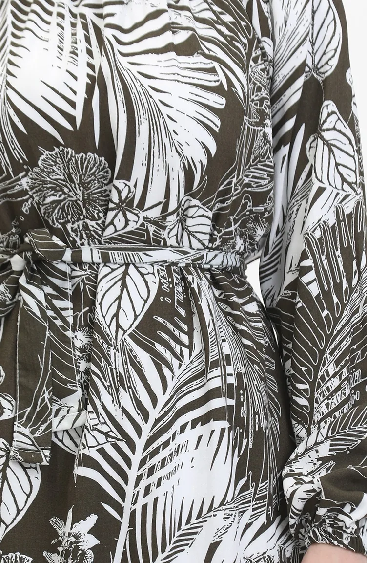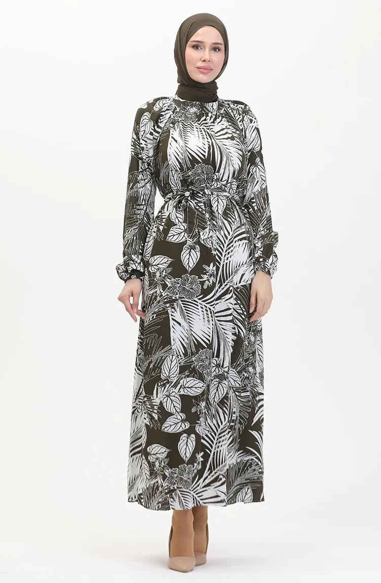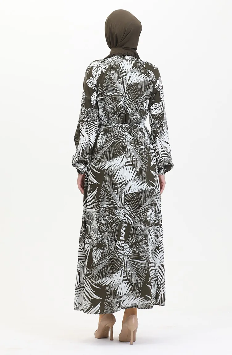 Gemustertes Viskosekleid Mit Gürtel 0485-04 Khaki Weiß 0485-04