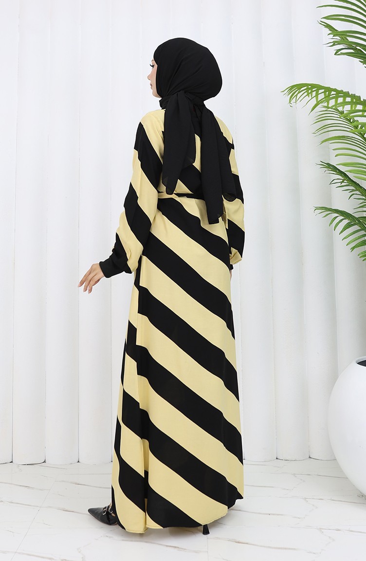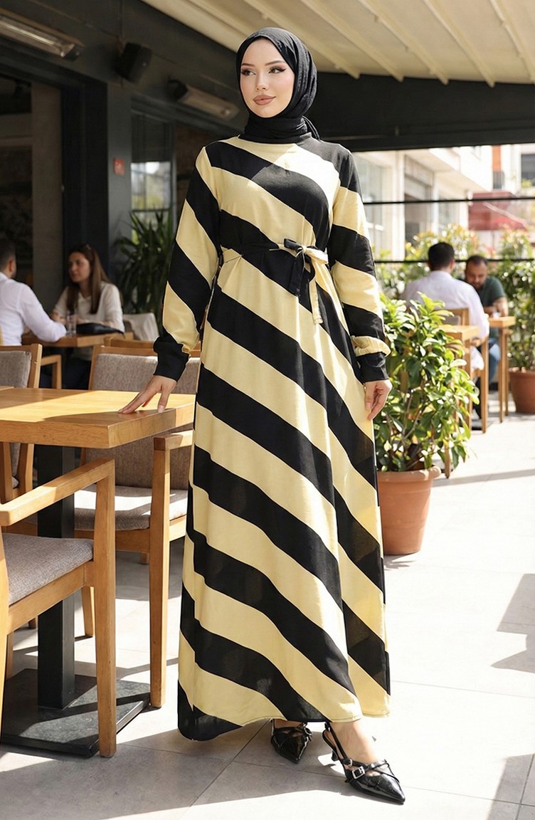 Geometrisch Gemustertes Viskosekleid Mit Gürtel 0460-04 Schwarz Gelb 0460-04