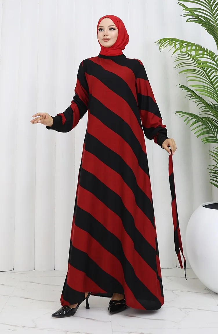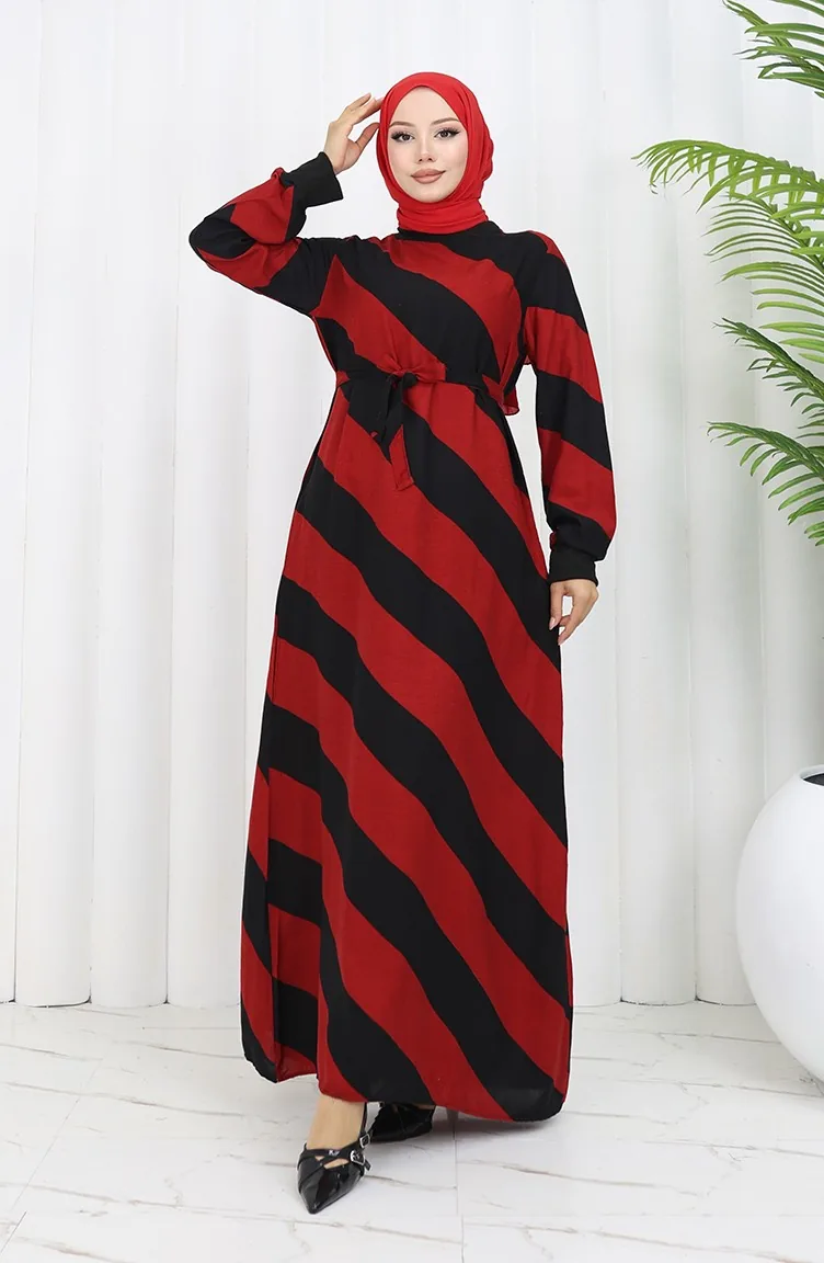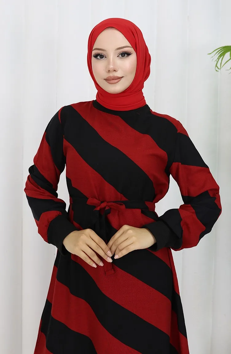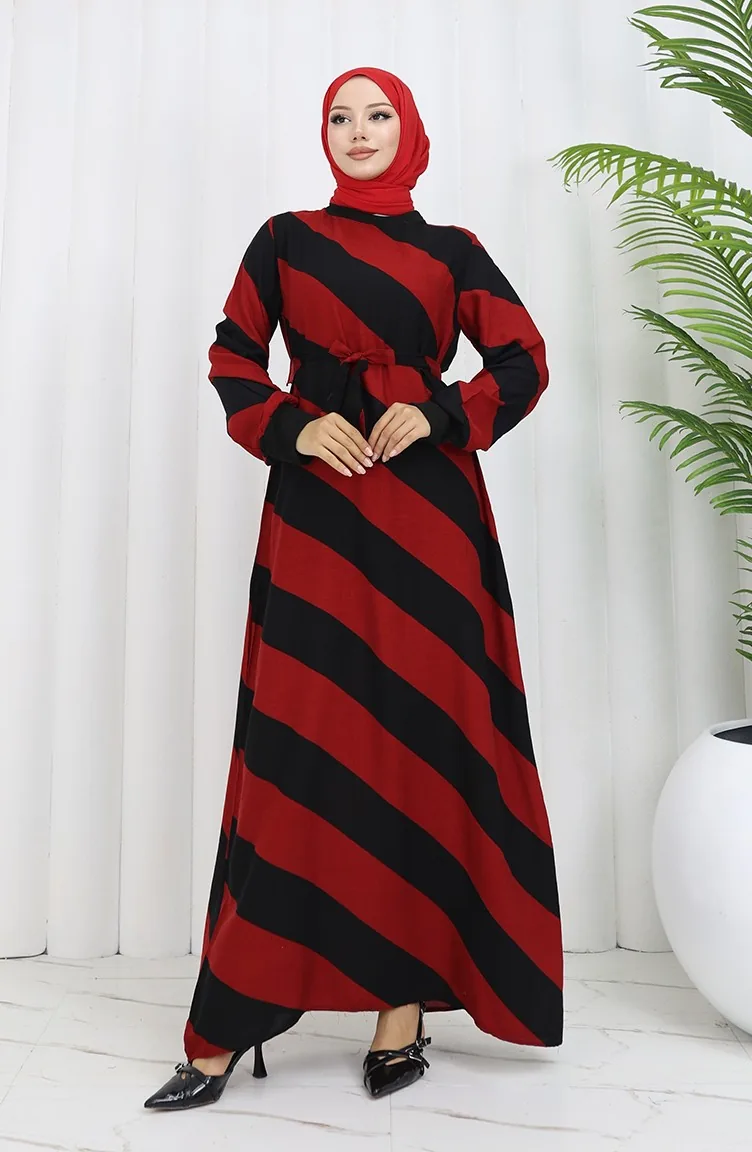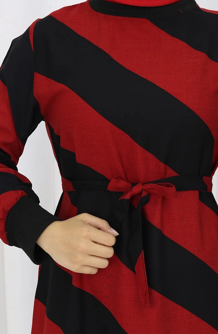 Geometrisch Gemustertes Viskosekleid Mit Gürtel 0460-08 Weinrot Schwarz 0460-08