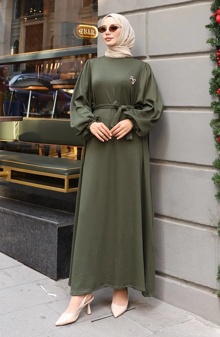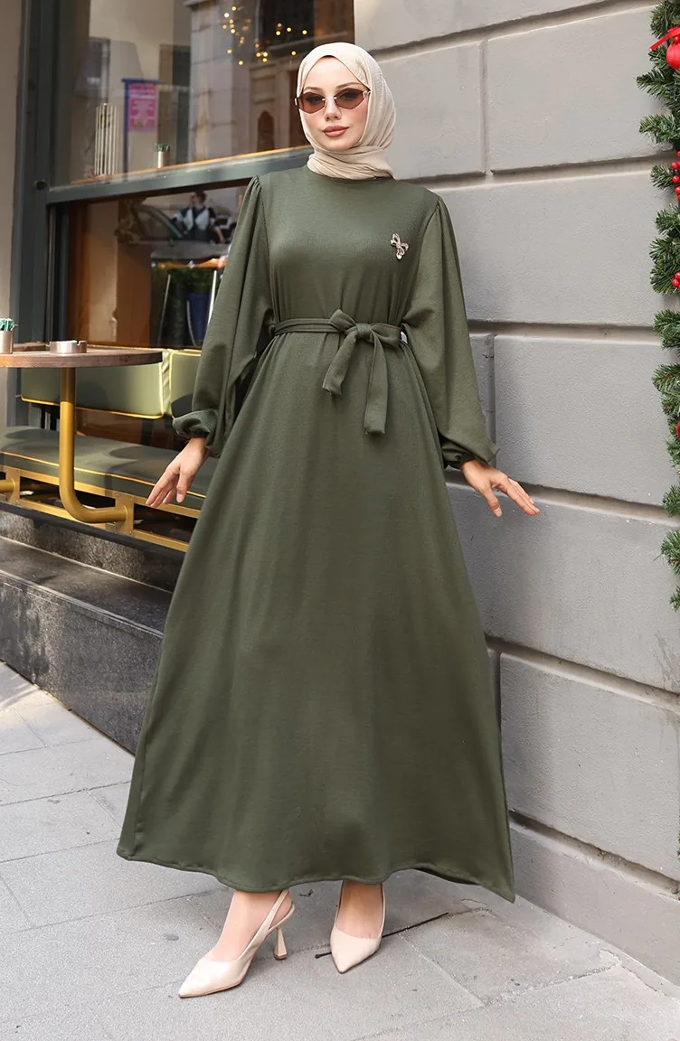 Hijab-Kleid Mit Broschenspitze Und Rippstrickdetails 0220-02 Khaki 0220-02