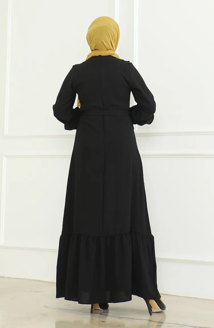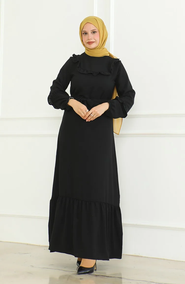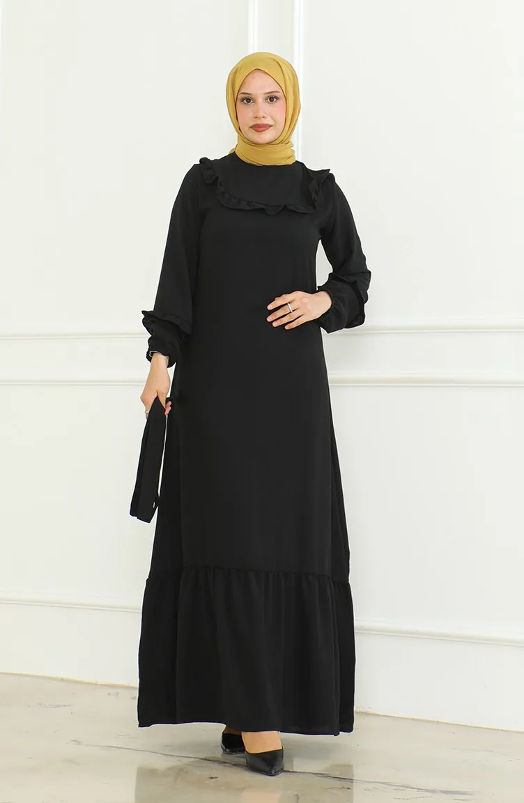 Kleid Aus Aerobin-Stoff Mit Rüschen Und Gürtel 0478-04 Schwarz 0478-04