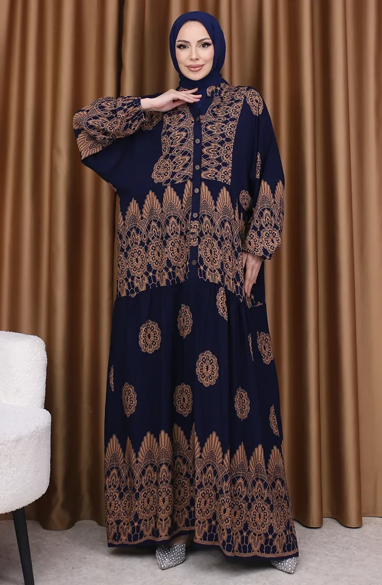 Dunkelblau farbe wurde verwendet. Viskose ist ein synthetischer Stofftyp und ist bequem und nützlich zu verwenden. Entworfen mit gemustertem Stoff. Es besteht aus Gummi Ärmeln. Hergestellt als Richter-Kragen. Es ist für vier Jahreszeiten geeignet. Große Größen Option ist verfügbar.