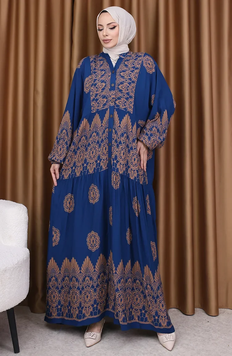 Kleid Mit Ballonärmeln Und Kachelmuster 5575-02 Indigo 5575-02