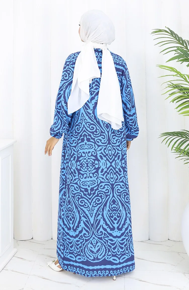 Blaufarbe wird verwendet. Viskose ist ein synthetischer Stofftyp und ist bequem und nützlich zu verwenden. Entworfen mit gemustertem Stoff. Es wurde mit Knopf verwendet, um die Verwendung zu vereinfachen. Es besteht aus Gummi Ärmeln. Hergestellt als Richter-Kragen. Es ist für vier Jahreszeiten geeignet. Rahat. Große Größen Option ist verfügbar.