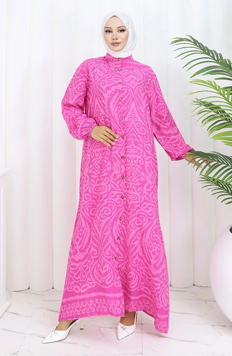Es hat Fuschia Färbung. Viskose ist ein synthetischer Stofftyp und ist bequem und nützlich zu verwenden. Entworfen mit gemustertem Stoff. Es wurde mit Knopf verwendet, um die Verwendung zu vereinfachen. Es besteht aus Gummi Ärmeln. Hergestellt als Richter-Kragen. Es ist für vier Jahreszeiten geeignet. Rahat. Große Größen Option ist verfügbar.