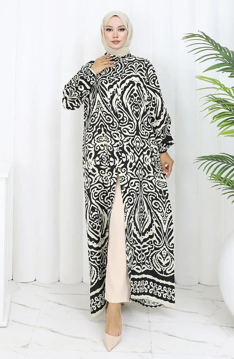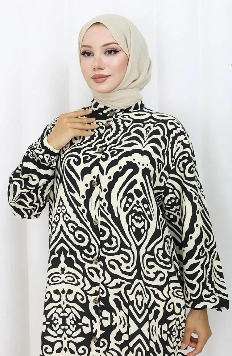 Schwarz farbe verwendet. Viskose ist ein synthetischer Stofftyp und ist bequem und nützlich zu verwenden. Entworfen mit gemustertem Stoff. Es wurde mit Knopf verwendet, um die Verwendung zu vereinfachen. Hergestellt als Richter-Kragen. Es ist für vier Jahreszeiten geeignet. Rahat. Große Größen Option ist verfügbar.