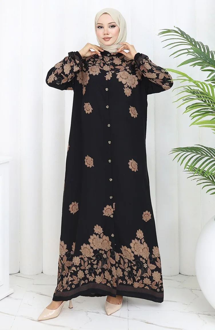 Schwarz farbe verwendet. Viskose ist ein synthetischer Stofftyp und ist bequem und nützlich zu verwenden. Entworfen mit gemustertem Stoff. Es wurde mit Knopf verwendet, um die Verwendung zu vereinfachen. Es besteht aus Gummi Ärmeln. Hergestellt als Richter-Kragen. Es ist für vier Jahreszeiten geeignet. Rahat. Große Größen Option ist verfügbar.