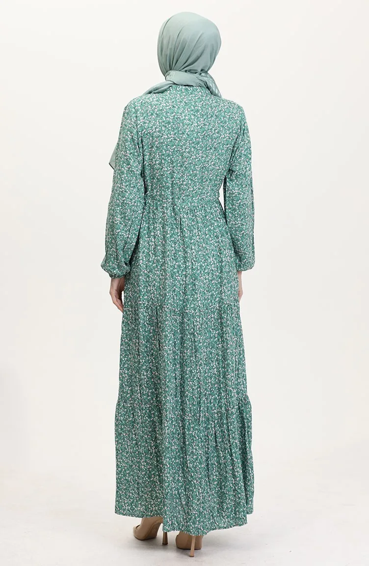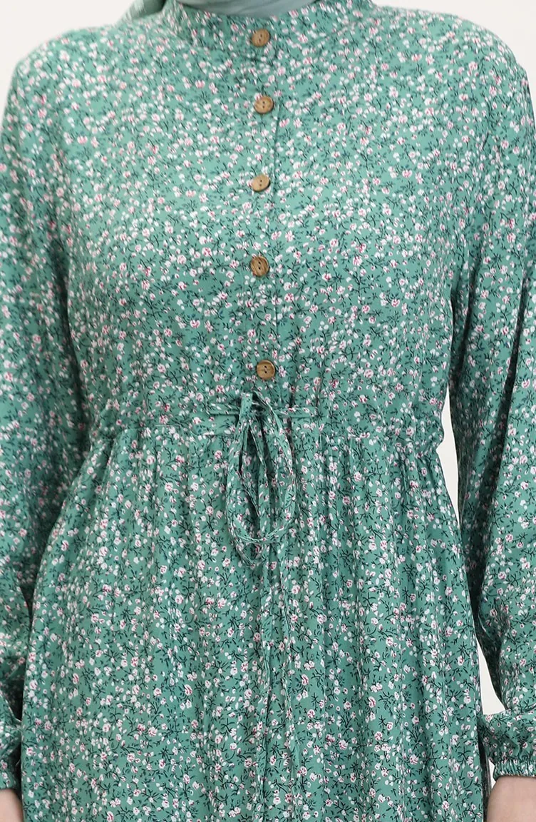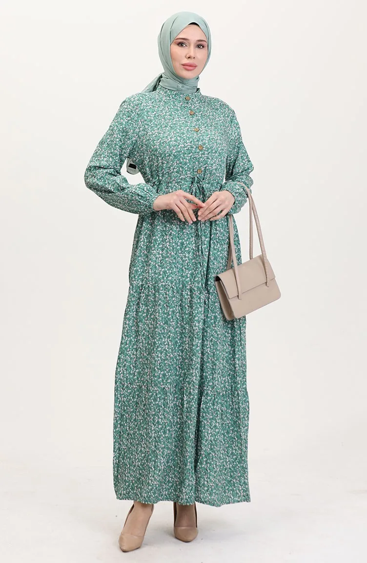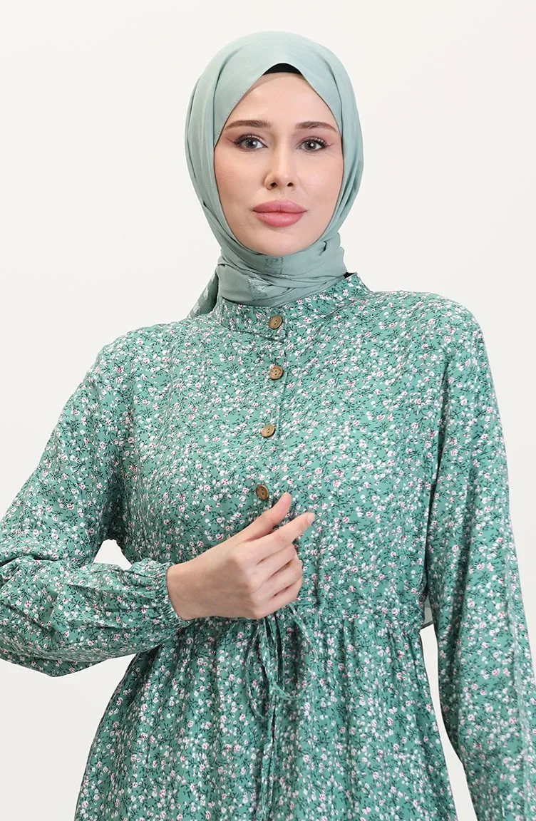 Viskose Stoff Halb Geknöpftes Gemustertes Kleid 0037-01 Grün 0037-01
