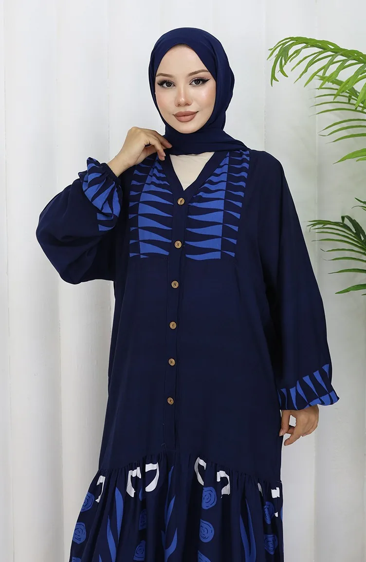 Viskose Stoff Halb Geknöpftes Kleid 0075-02 Marineblau 0075-02