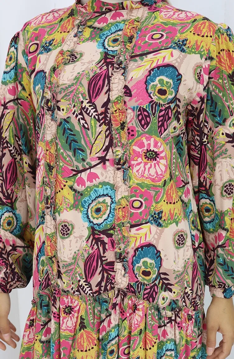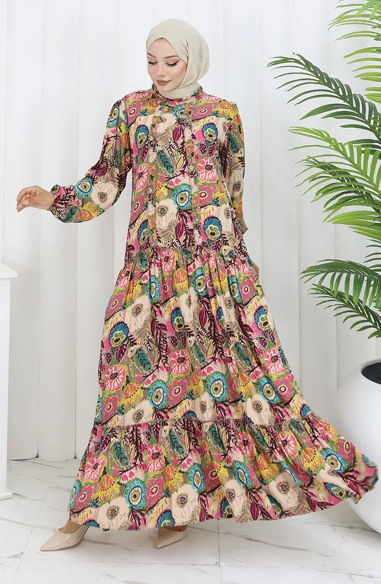 Es hat Fuschia Färbung. Viskose ist ein synthetischer Stofftyp und ist bequem und nützlich zu verwenden. Entworfen mit gemustertem Stoff. Das Produkt kann mit Ungefüttert verwenden. Es besteht aus Gummi Ärmeln. Jede Kleidungsseite ist die bevorzugte Nullkragenform. Es ist für vier Jahreszeiten geeignet. Große Größen Option ist verfügbar.
