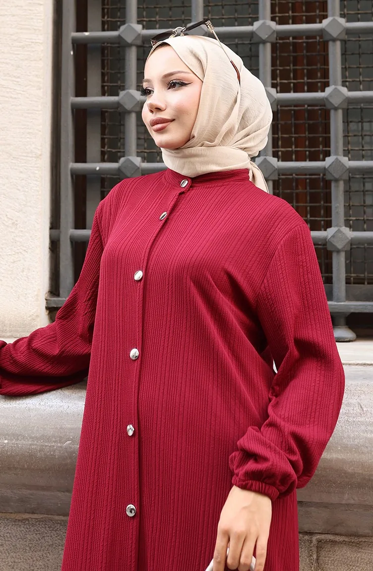 Geknöpfter Gerippter Hijab-Hosenanzug 2177-02 Bordeauxrot 2177-02