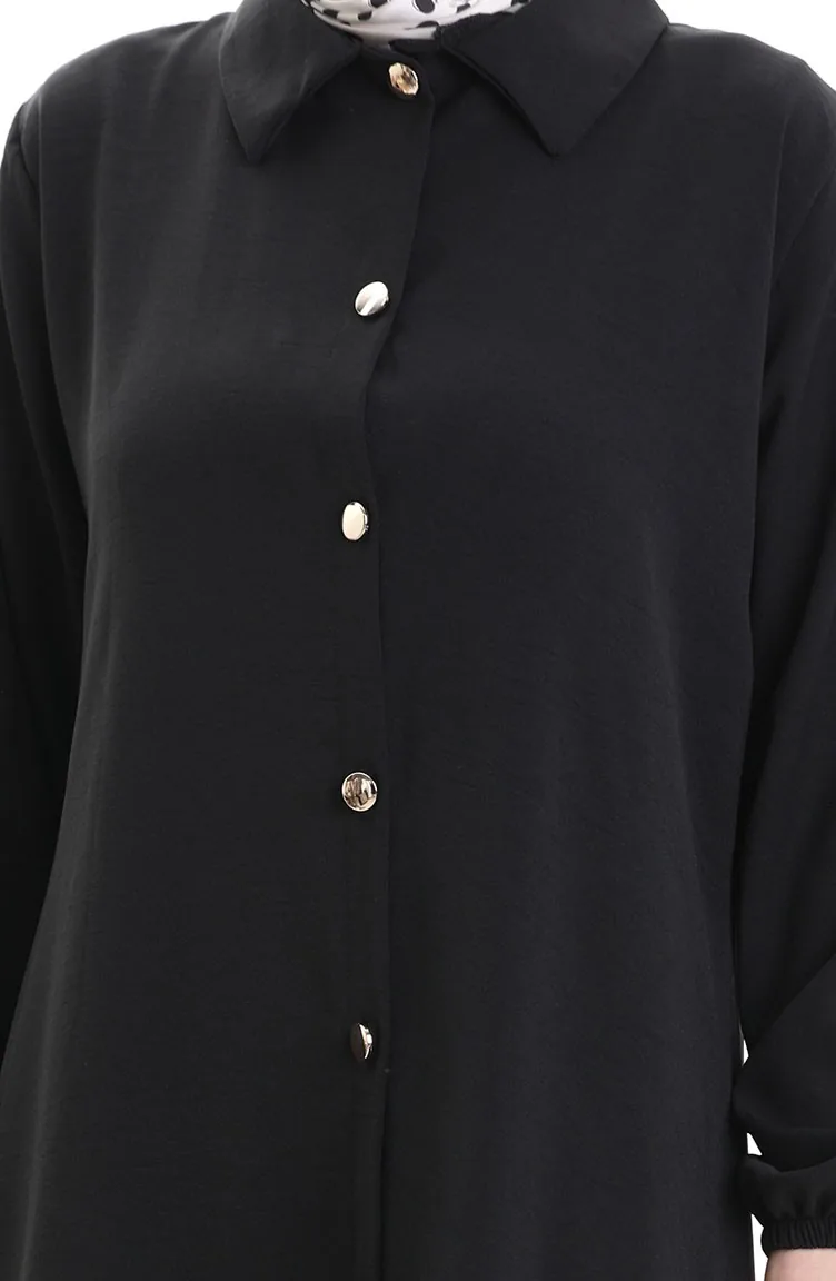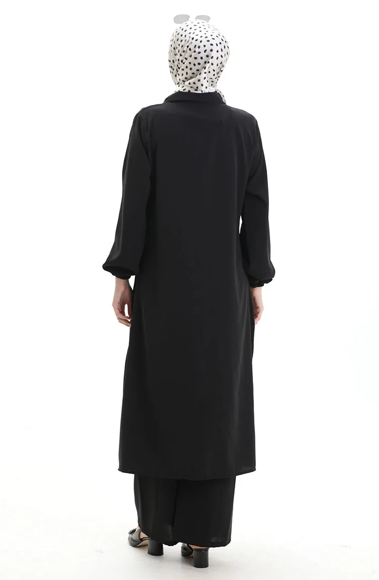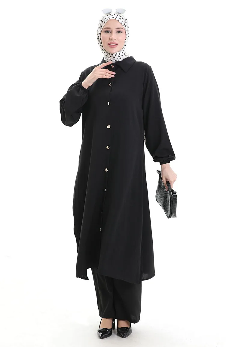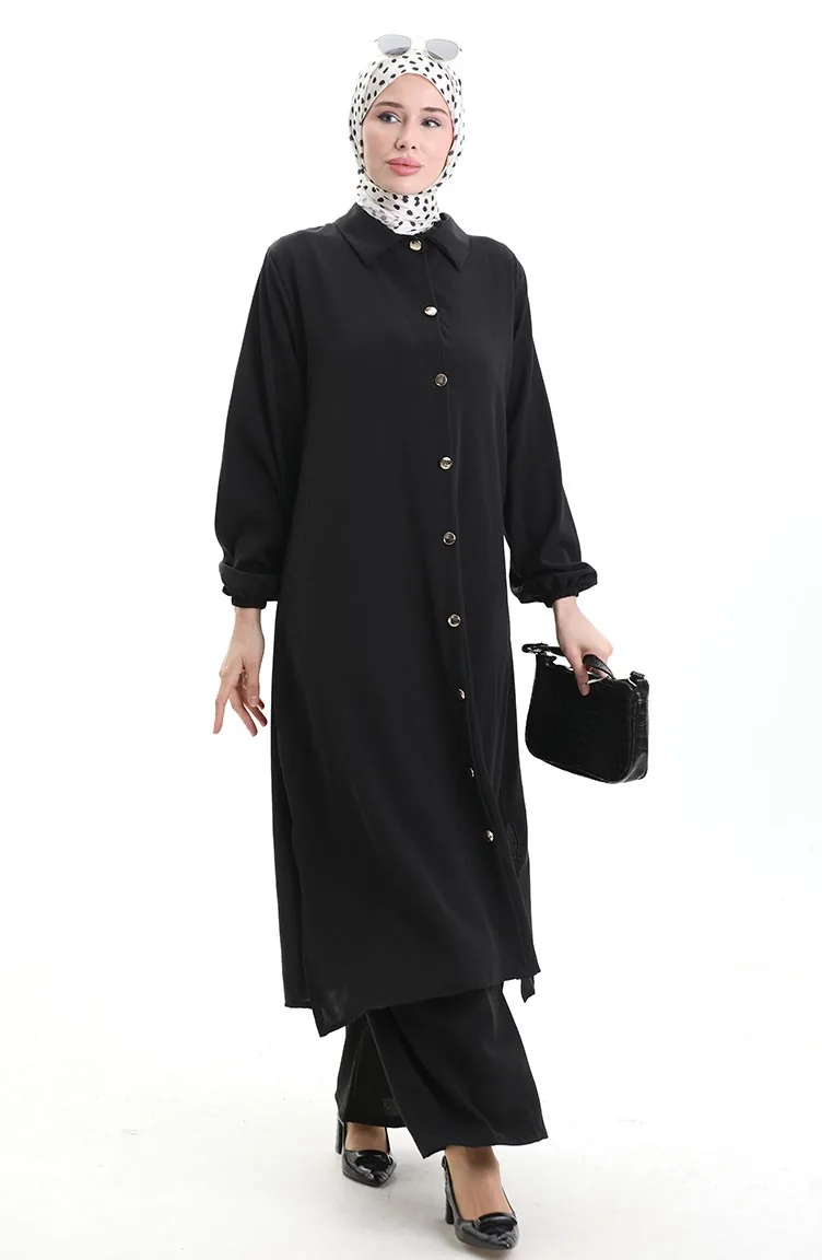 Geknöpfter Langer Tunika-Hosen-Zweiteiler 0089-02 Schwarz 0089-02