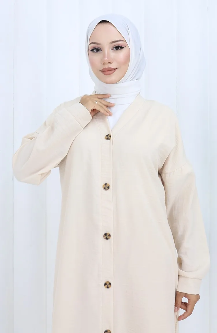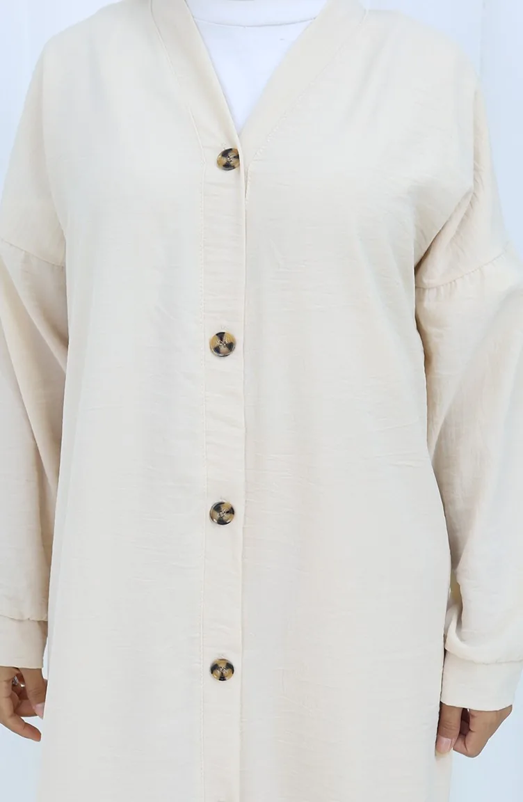Es ist Beige Farbe. Aerobin. Es ist eine klare Sicht. Es wurde mit Knopf verwendet, um die Verwendung zu vereinfachen. Es ist in Form von V-Ausschnitt geschnitten und eine anderes aussehen ist an der Seite des Produkts hinzugefügt. Es ist für vier Jahreszeiten geeignet. Große Größen Option ist verfügbar.