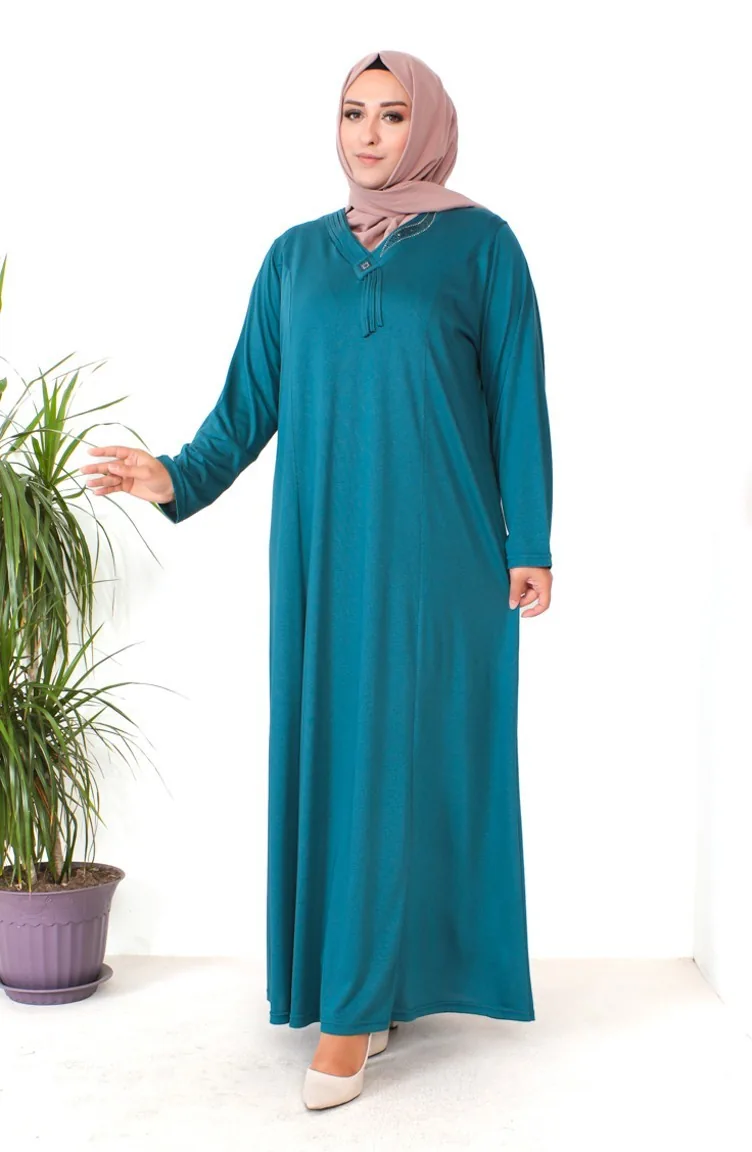Übergröße Kleid Aus Gekämmter Baumwolle Mit Steinmuster 4932-02 Petrol 4932-02