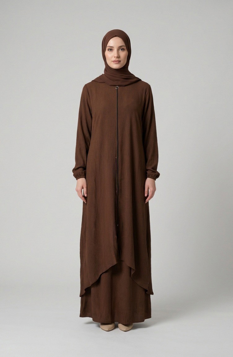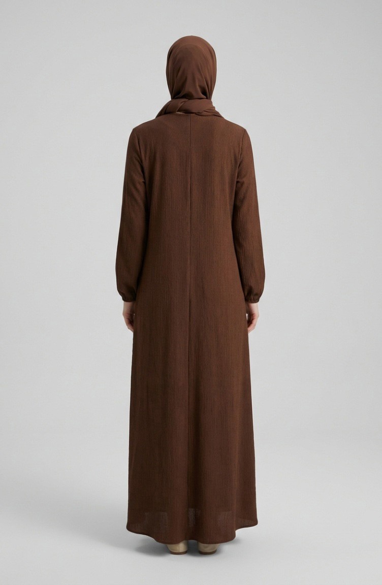Braunfarbe wird verwendet. Es ist aus Krepp Stoff. Es ist eine klare Sicht. Reißverschluss ist für die einfache Handhabung verwendet. Es besteht aus Gummi Ärmeln. Jede Kleidungsseite ist die bevorzugte Nullkragenform. Es ist für vier Jahreszeiten geeignet. Große Größen Option ist verfügbar.