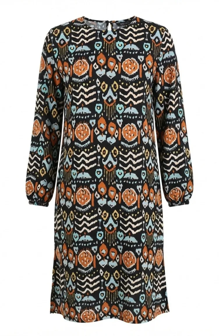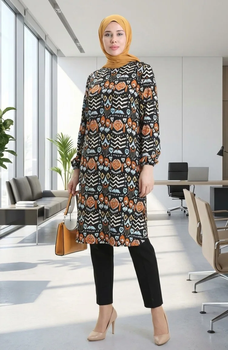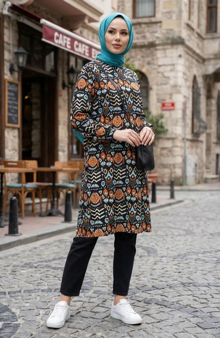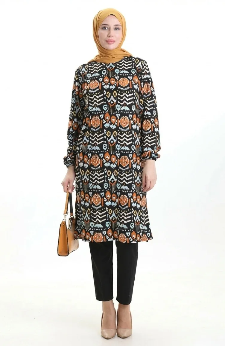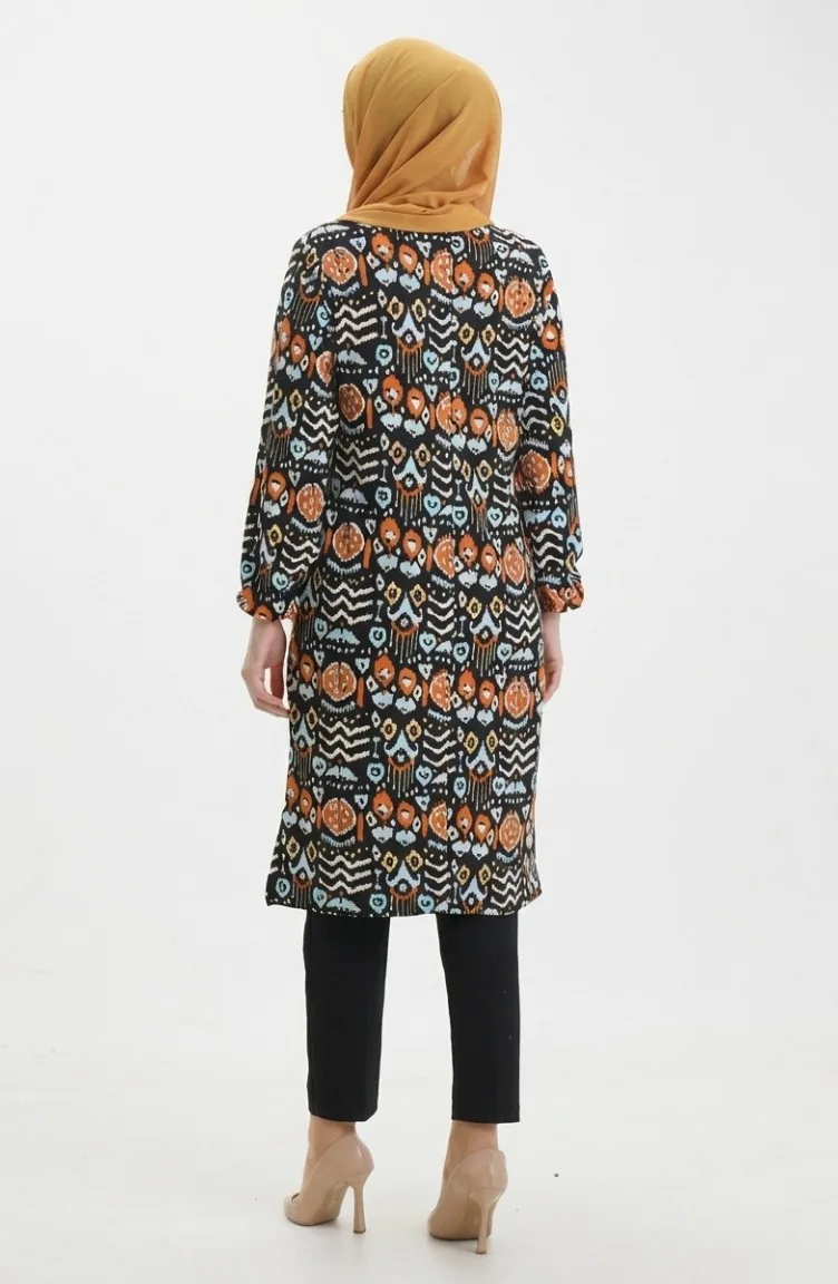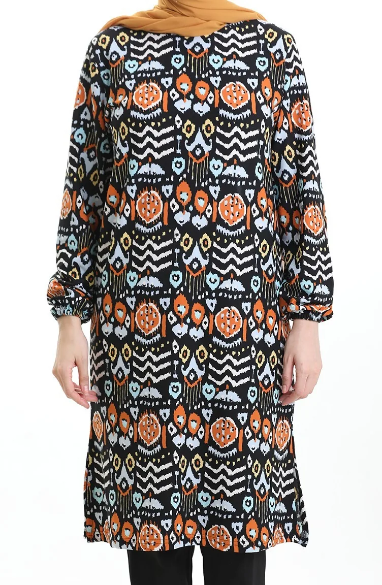 Digital Bedruckte Tunika Mit Schlitzdetails 1005-01 Schwarz Ziegel 1005-01