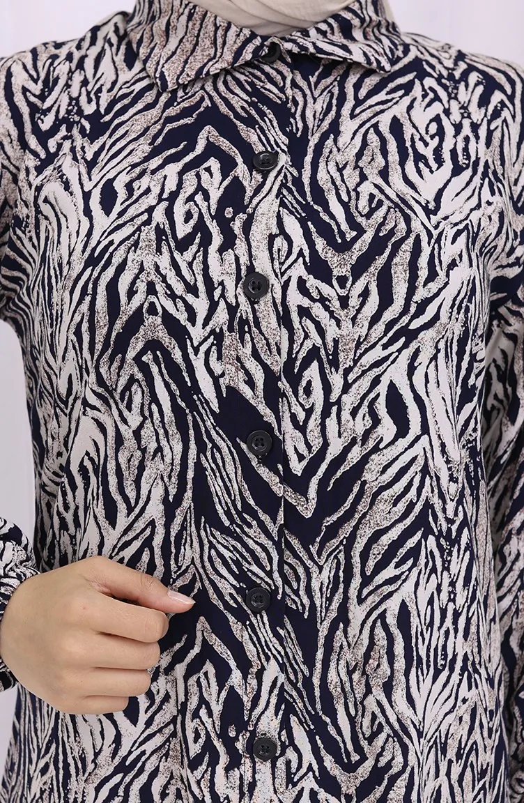 Viskose Stoff Geknöpfte Lange Tunika 2027-03 Marine Blau Beige 2027-03