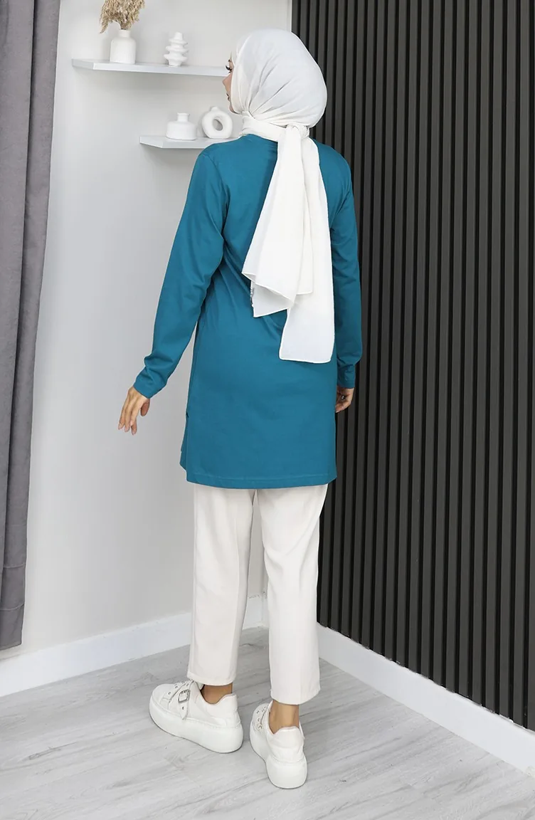Petroleumfarbe wird verwendet. Baumwollgewebe hat eine saugfähige Textur. Es ist eine klare Sicht. Wenn die Tunika mit einem anderen Produkt kombiniert wird, erhält man einen schönen Anzug. Jede Kleidungsseite ist die bevorzugte Nullkragenform. Es ist für vier Jahreszeiten geeignet. Der Körpergröße, den die Models trägt, ist optisch visuelle körpergröße.