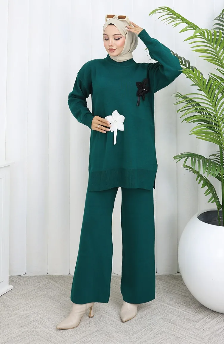 Strickmode Geblümte Tunika Hose Zweiteiler 1077-07 Petrol 1077-07
