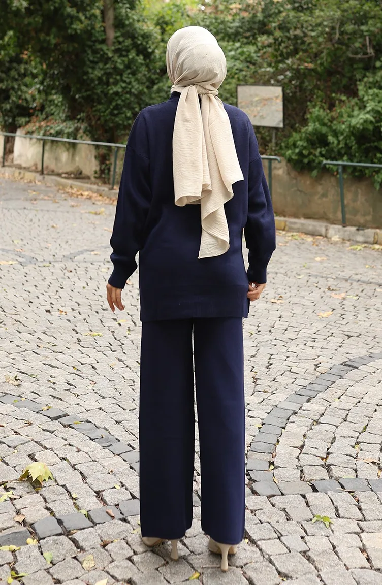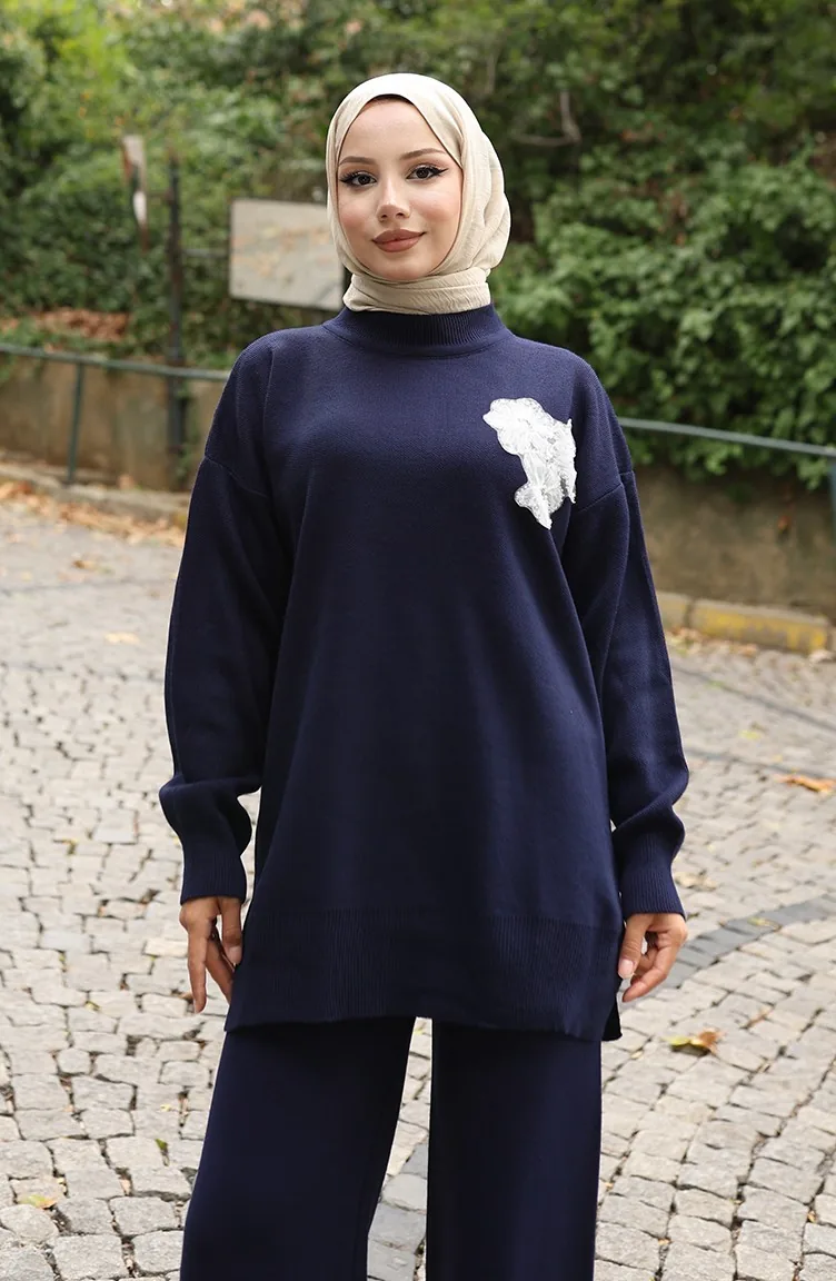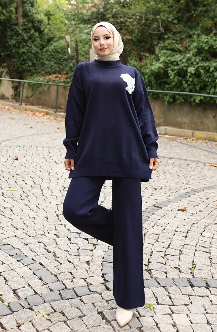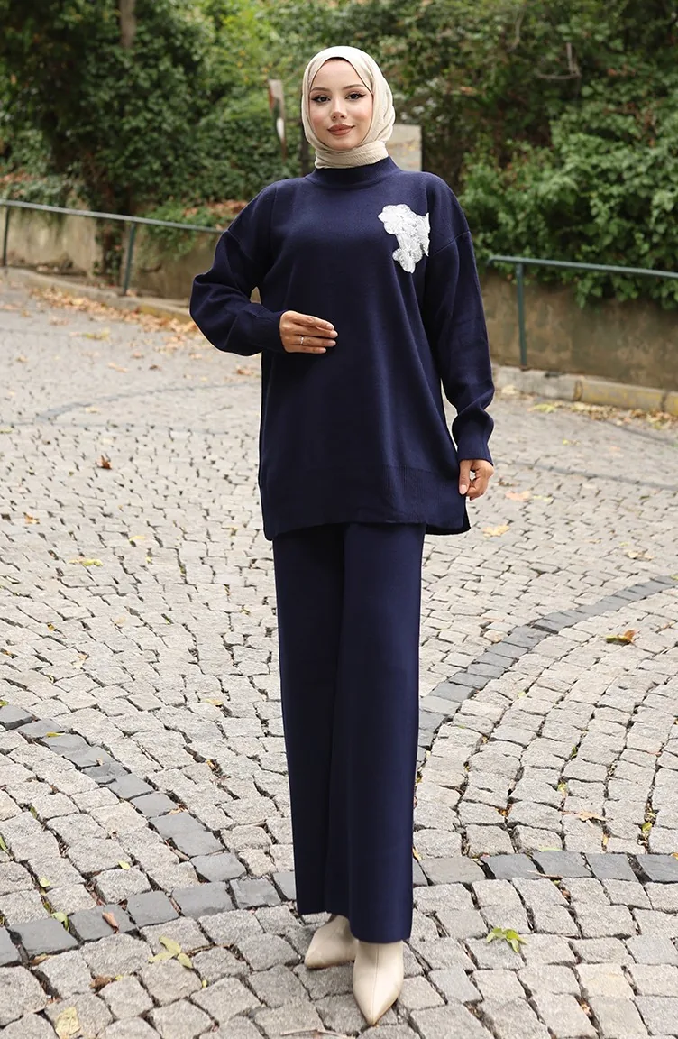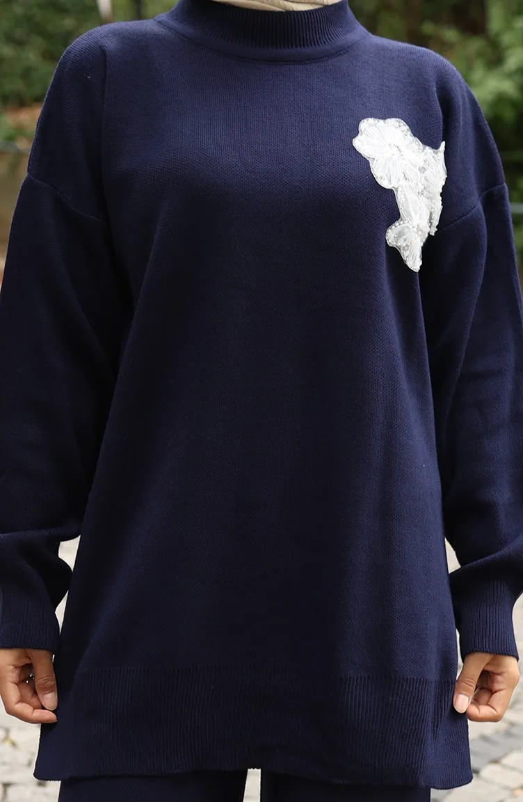 Strickmode Perlenbestickte Tunika Hose Zweiteiliger Anzug 1021-06 Marineblau 1021-06