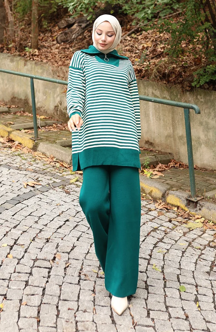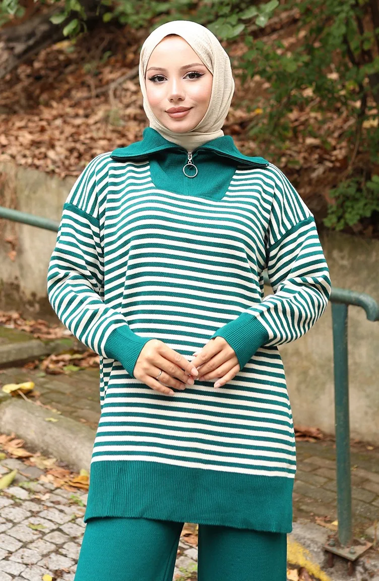 Strickpullover Rollkragen Gestreifte Tunika Hose Zweiteiliger Anzug 1098-07 Petrol 1098-07