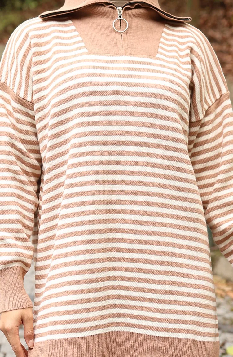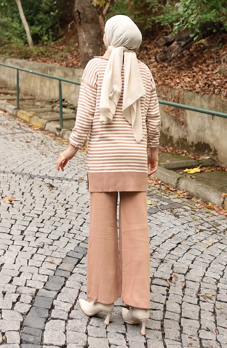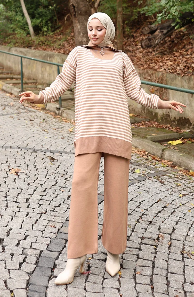 Strickwaren Rollkragen Gestreifte Tunika Hose Zweiteiler 1098-05 Milchkaffee 1098-05