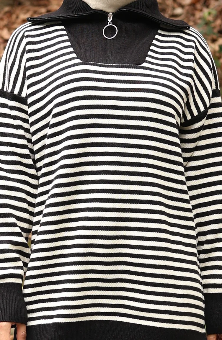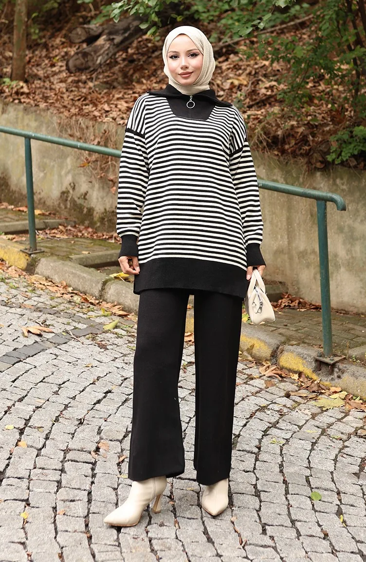 Strickwaren Rollkragen Gestreifte Tunika Hose Zweiteiler 1098-06 Schwarz 1098-06