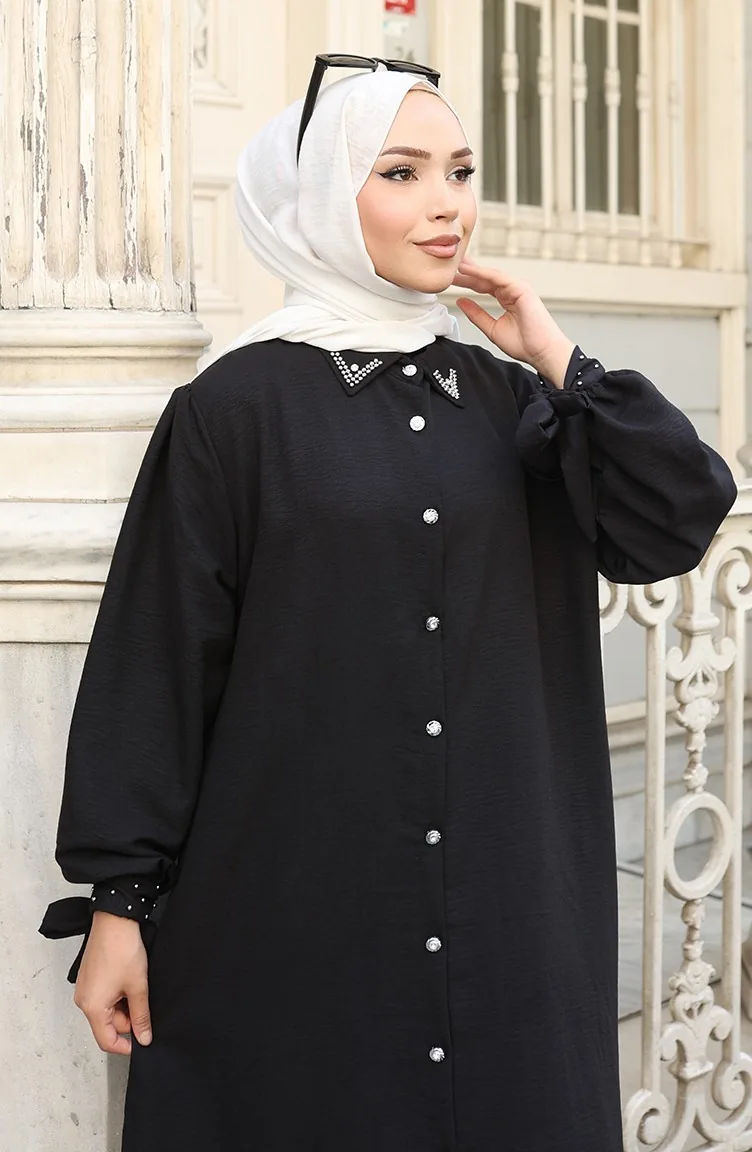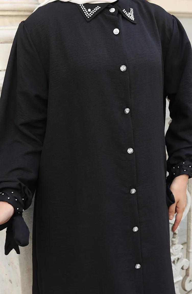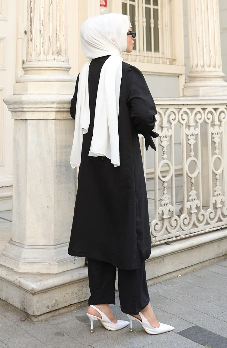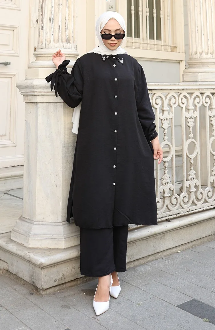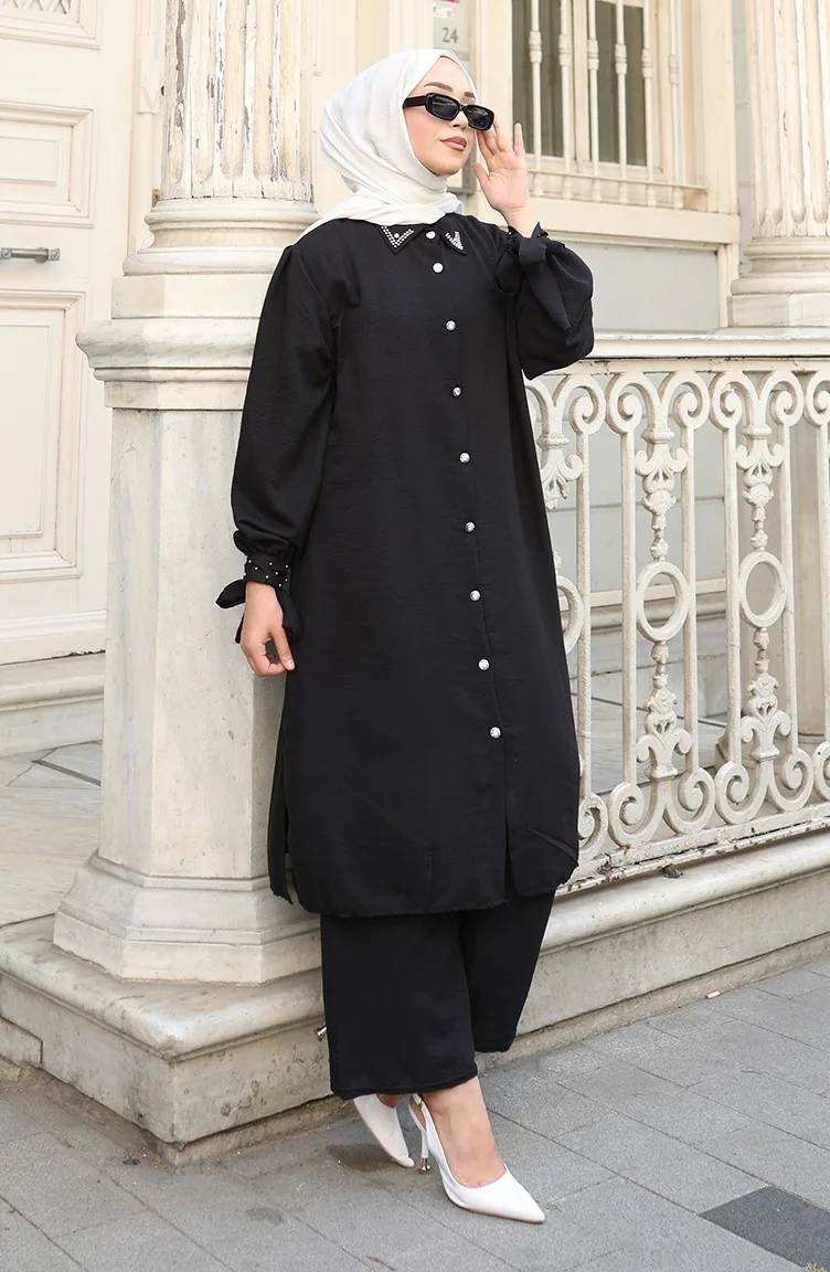 Aerobin Stoff Geknöpfte Tunika Hose Zweiteiliger Anzug 2147-05 Schwarz 2147-05