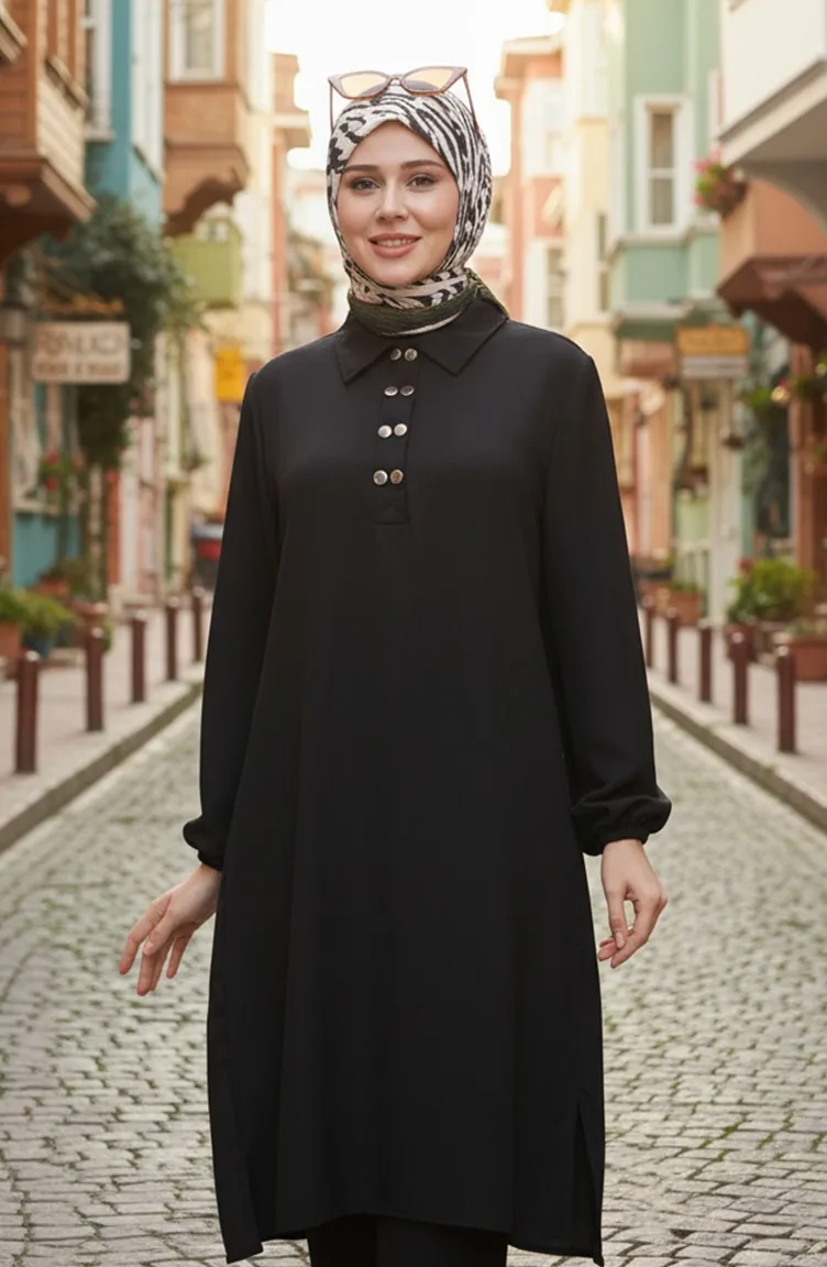 Schwarz farbe verwendet. Baumwollgewebe hat eine saugfähige Textur. Es ist eine klare Sicht. Wenn die Tunika mit einem anderen Produkt kombiniert wird, erhält man einen schönen Anzug. Es besteht aus Gummi Ärmeln. Hemdkragen ist ein Muss für viele Kombinationen. Es ist für vier Jahreszeiten geeignet. Große Größen Option ist verfügbar.