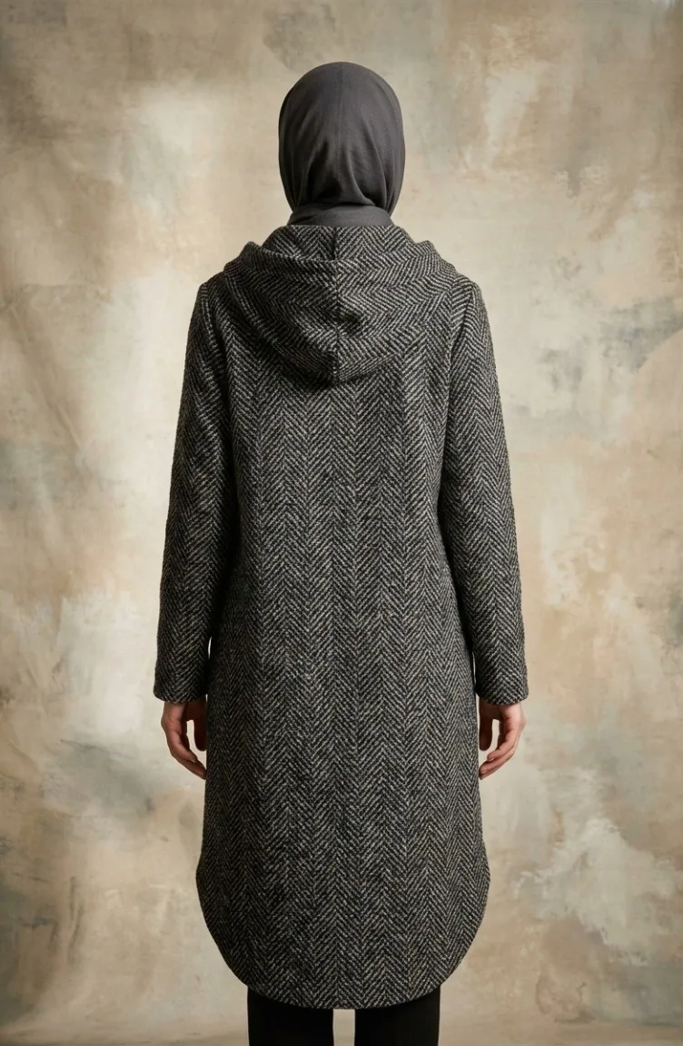 Kapüşonlu Düğmeli Kaşe Kap 0201-19 Siyah 0201-19