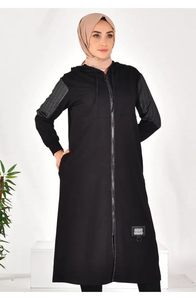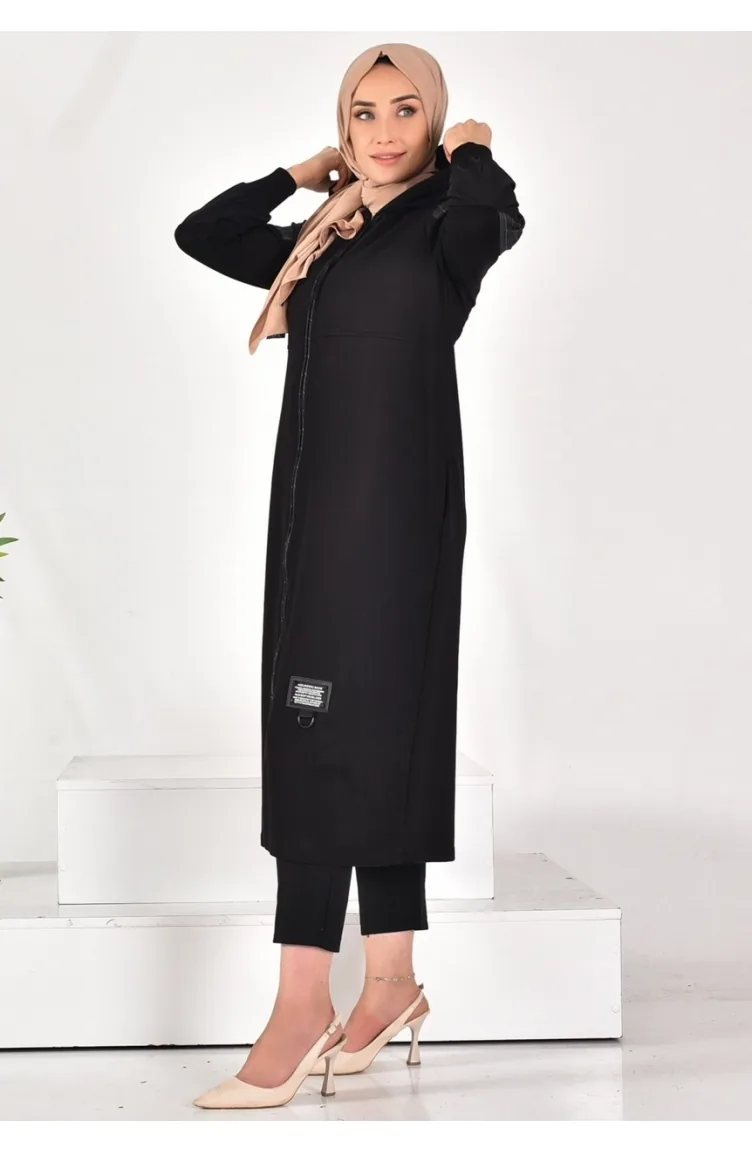 Schwarz farbe verwendet. Es wurde zwei Seilgewebe verwendet. Es ist eine klare Sicht. Es kann jede Jahreszeit mit Kapuze zur Verfügung gestellt werden. Es ist Langärmlig. Jede Kleidungsseite ist die bevorzugte Nullkragenform. Es ist für vier Jahreszeiten geeignet. Frau. Es wurde aus breiter Schnitt Form entworfen.