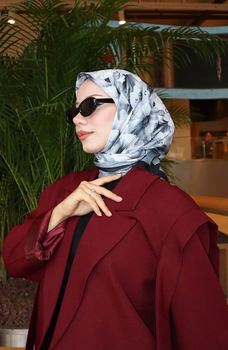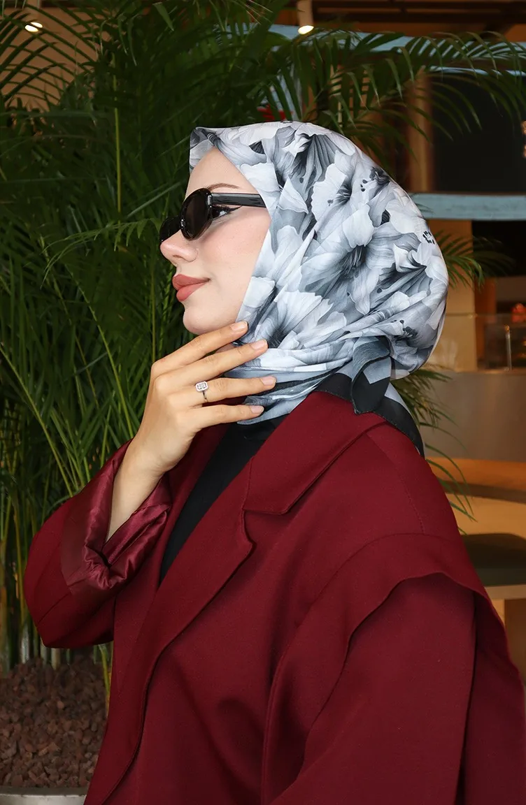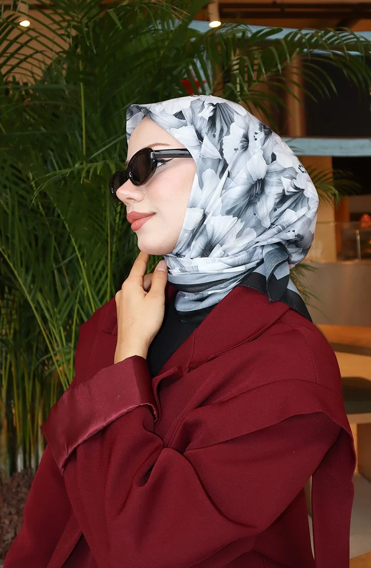 Çiçek Desenli Eşarp 70332-09 Siyah Gri