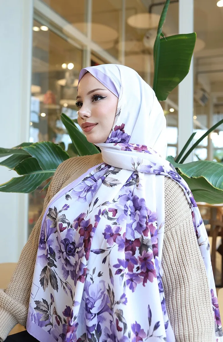 Çiçek Desenli Capri Şal 70349-03 Lila Ekru